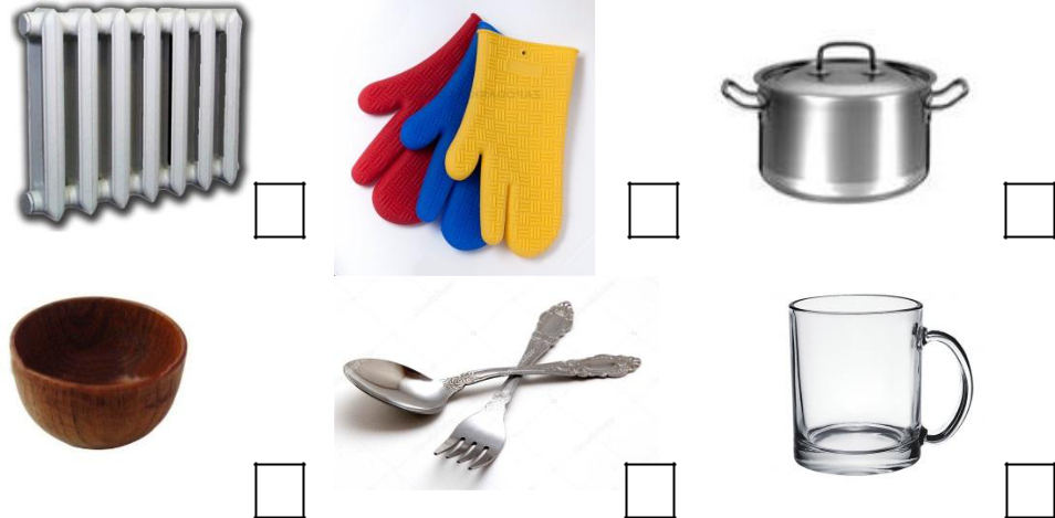 Суреттерге қара. Жылуды жақсы өткізетін денелерді белгіле (✓).