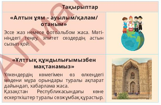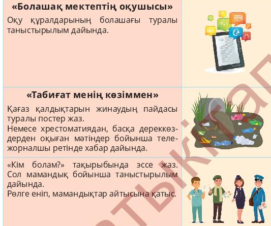 Ынтымақтастық атмосферасын қалыптастыру «Ізгі тілек» арқылы өтеді. Топқа бөлу «Таңдау» әдісімен жүреді. -Берілген суреттердің біреуін таңдап, топқа бірігіп отырыңдар. Өткен тақырыпқа шолу: -Үй тапсырмасын сұрау. -Бір-біріңе өткен тақырыпқа байланысты сұрақтар қойып жауап алыңдар. Жаңа оқу материалын жариялау «Ой қозғау» әдісі: -Тақтада берілген тақырыптар ішінен өздерің таңдап алған суреттеріңе сай келетінін анықтаңдар. «Алтын ұям - ауылым/қалам/Отаным» «Ұлттық құндылықтарымызбен мақтанамыз» «Болашақ мектептің оқушысы» «Табиғат менің көзіммен» «Кім болам?» -Өте жақсы, бүгінгі сабақта өздерің таңдап алған сурет бойынша берілген тақырыптарға жоба жасайтын, оны қорғайтын боласыңдар. |