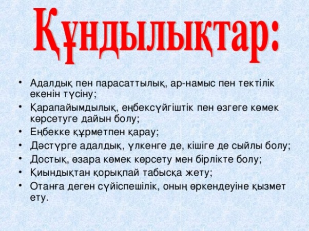 1-тапсырма.Талқылау «Әйел-Ана» ертегісі «Əрбір ана үшін баласы қымбат, əрбір адам үшін Отаны қымбат. Осындай адамға ғана тəн махаббат, сүйіспеншілік, мейірімділік сезімдер құндылық деп аталады. Құндылық – бұл ұғым, яғни қандай да бір нəрсенің мəнділігі, маңыздылығы, қалаулылығы, қымбаттығы. Басты құндылықтар: Отан, отбасы, ана тілі, рəміздер». 2-тапсырма. Тыңдау және талқылау «Көк тудың желбірегені» әні 3-тапсырма.Шығармашылық жұмыс