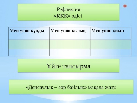 Рефлексия: Мен не білдім? -Бүгін мен не үйрендім -Мен үшін қандай тапсырма болды -Ал қай тапсырманы мен оңай оррындадым |