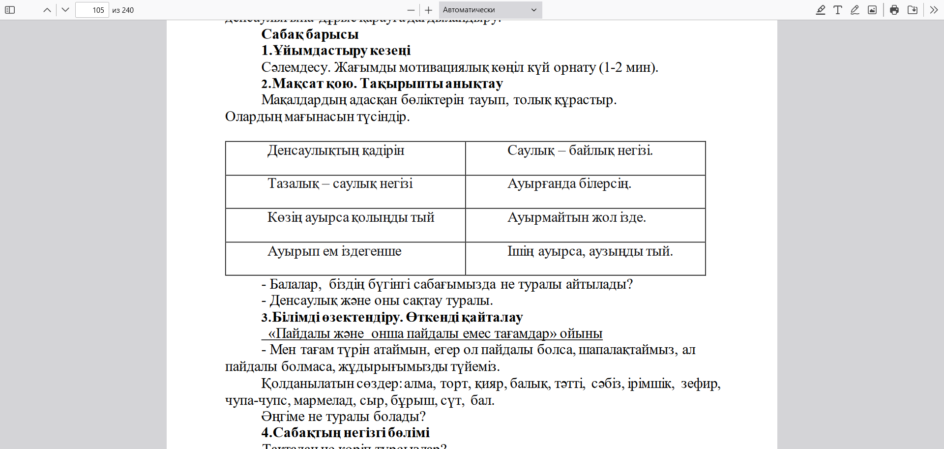 - Балалар, біздің бүгінгі сабағымызда не туралы айтылады? - Денсаулық және оны сақтау туралы. 3. Білімді өзектендіру. Өткенді қайталау «Пайдалы және онша пайдалы емес тағамдар» ойыны - Мен тағам түрін атаймын, егер ол пайдалы болса, шапалақтаймыз, ал пайдалы болмаса, жұдырығымызды түйеміз. Қолданылатын сөздер: алма, торт, қияр, балық, тәтті, сәбіз, ірімшік, зефир, чупа-чупс, мармелад, сыр, бұрыш, сүт, бал. Әңгіме не туралы болады? 4.Сабақтың негізгі бөлімі Тақтадан не көріп тұрсыздар?