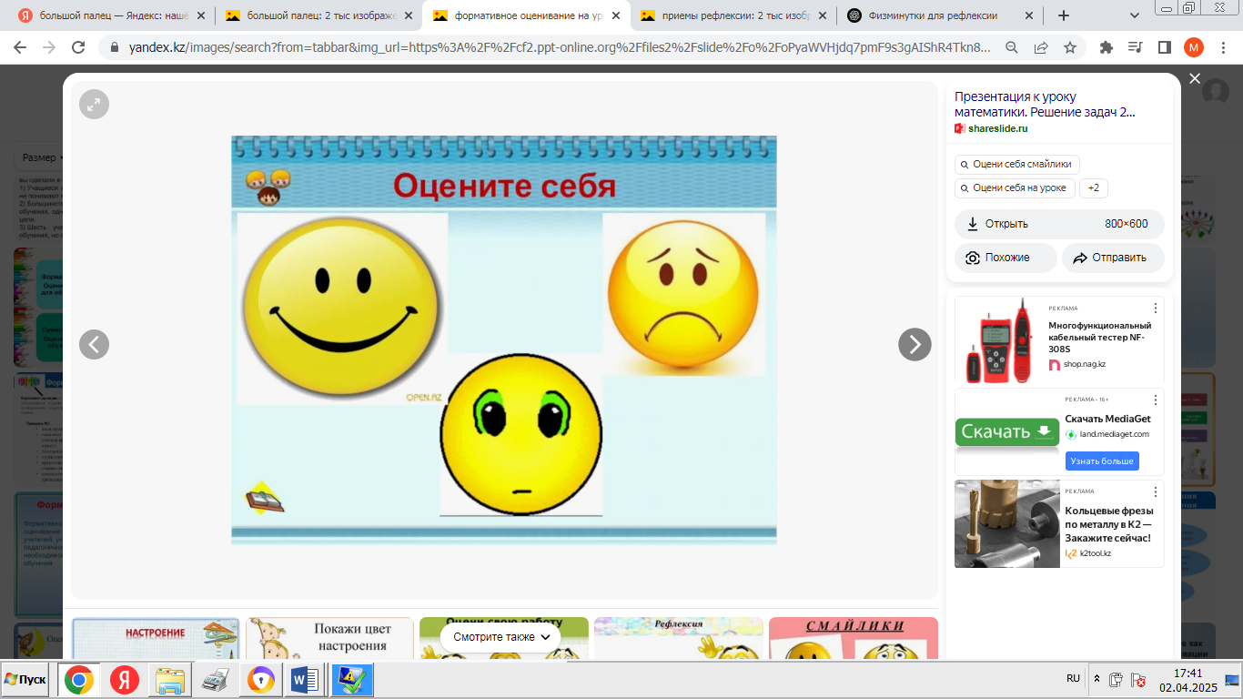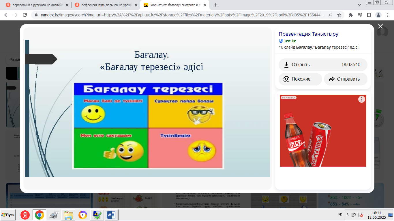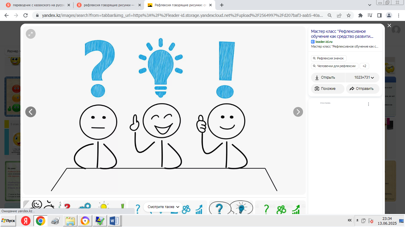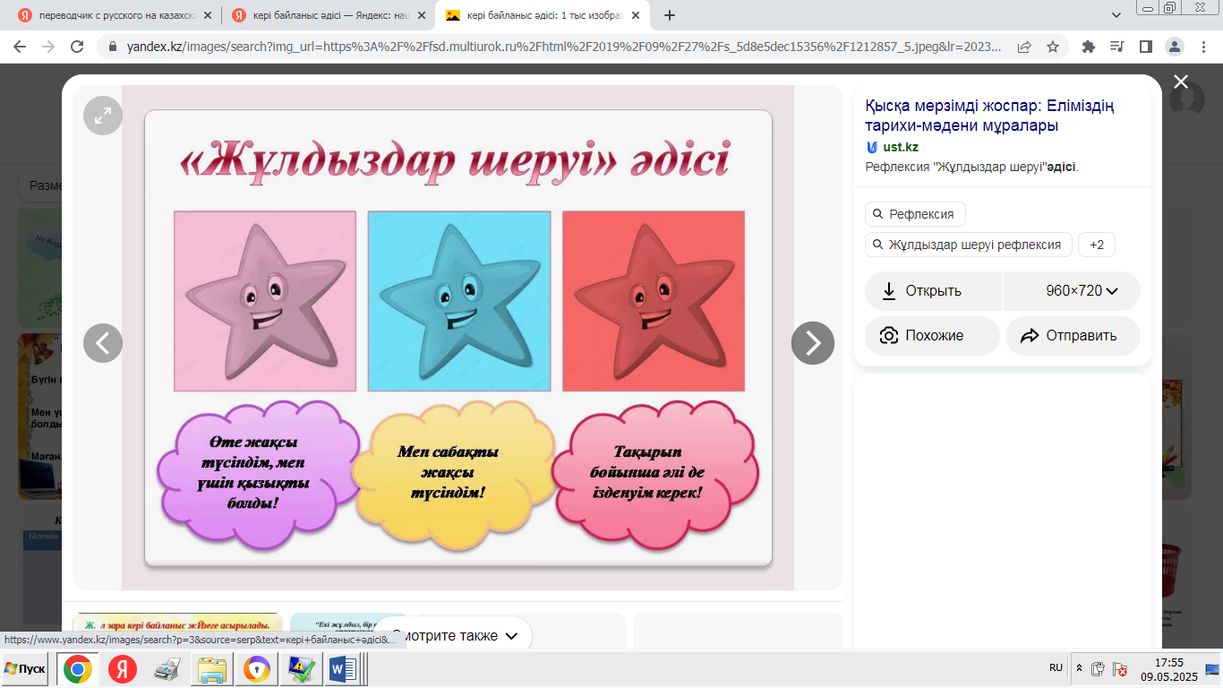 - «Мадақтау және қолдау» ойыны: әрқайсысы екіншісінің өнімділігі туралы оң пікір айтады. -Сабақтың қорытындысы: «Ең жақсысы не болды?», «Нені жақсартуға болады?» - «Менің жобаны қорғау тәжірибем» кері байланыс. - Үй тапсырмасы: жоба туралы қысқаша есеп дайындаңыз. |