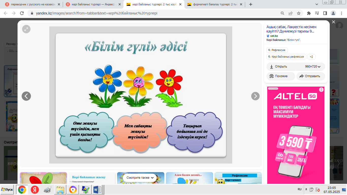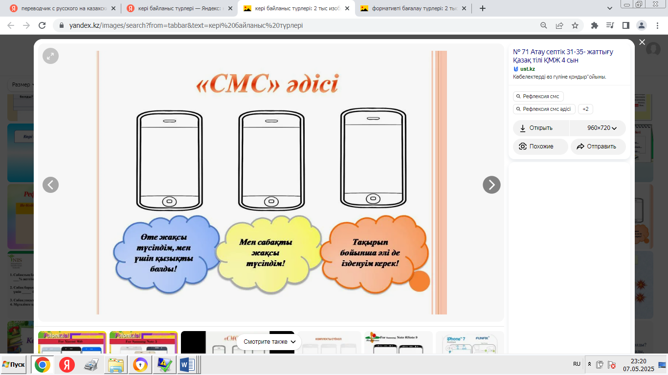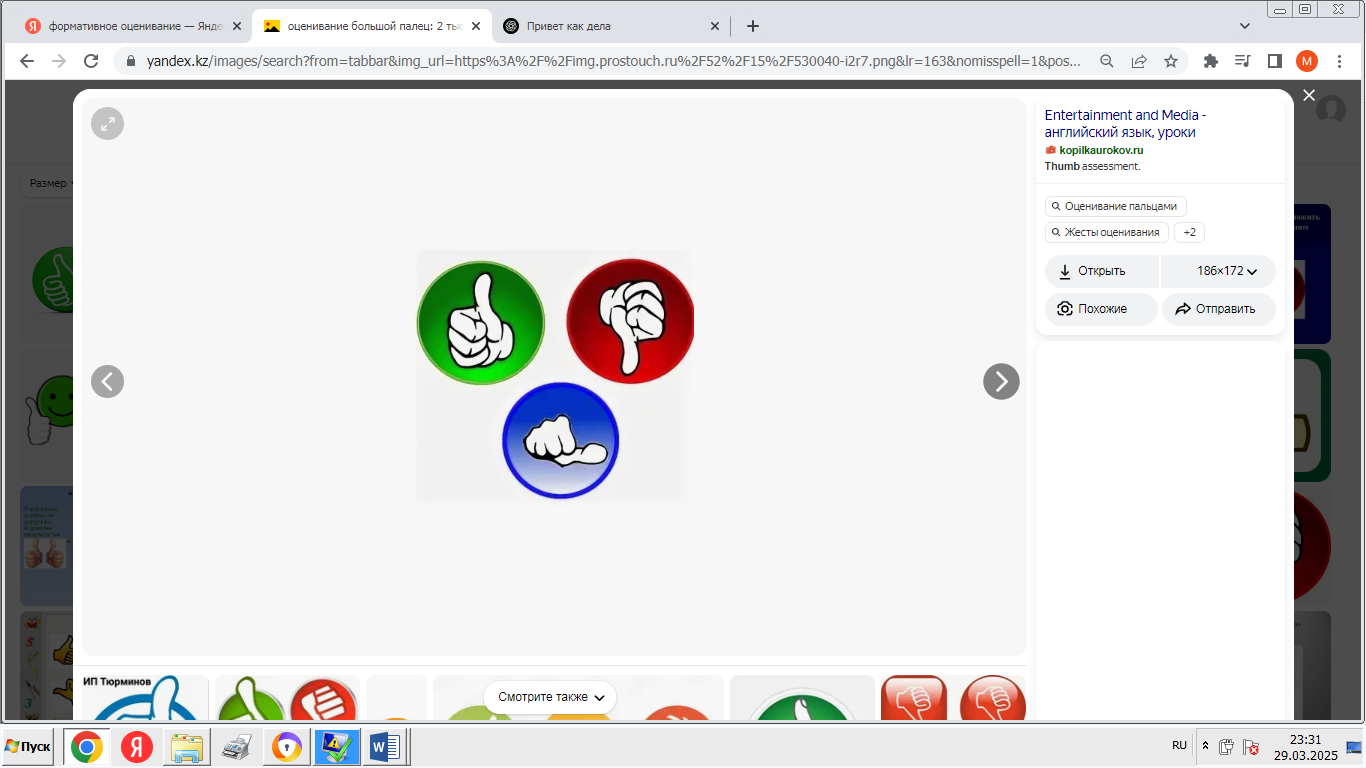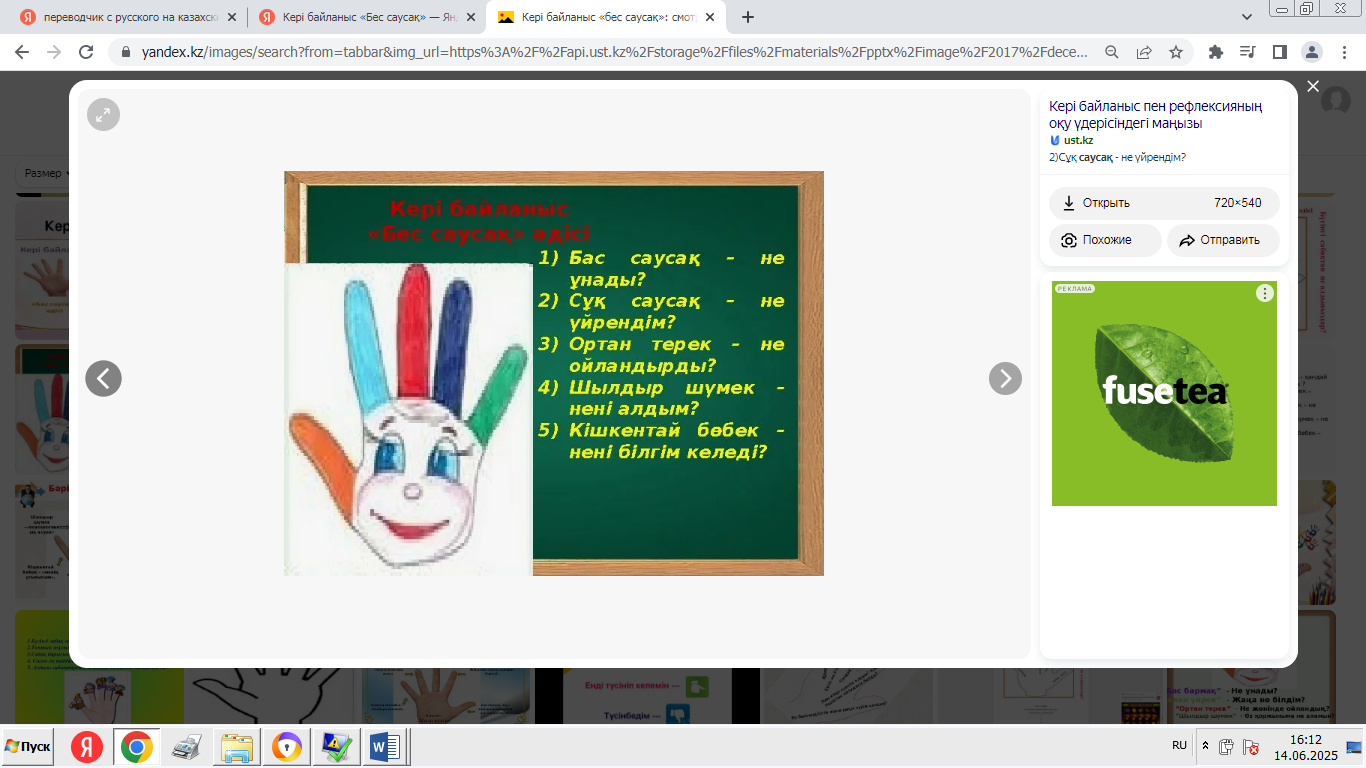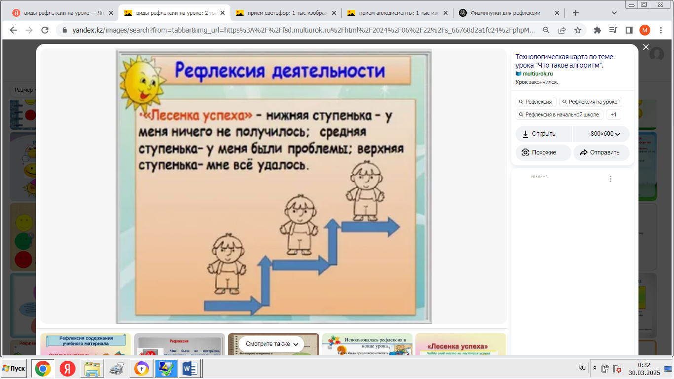 - «Мадақтау және қолдау» ойыны: әрқайсысы екіншісінің өнімділігі туралы оң пікір айтады. -Сабақтың қорытындысы: «Ең жақсысы не болды?», «Нені жақсартуға болады?» - «Менің жобаны қорғау тәжірибем» кері байланыс. - Үй тапсырмасы: жоба туралы қысқаша есеп дайындаңыз. |