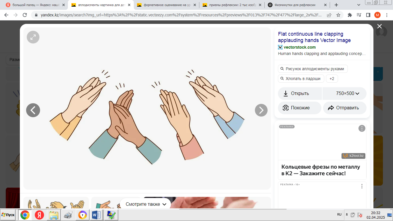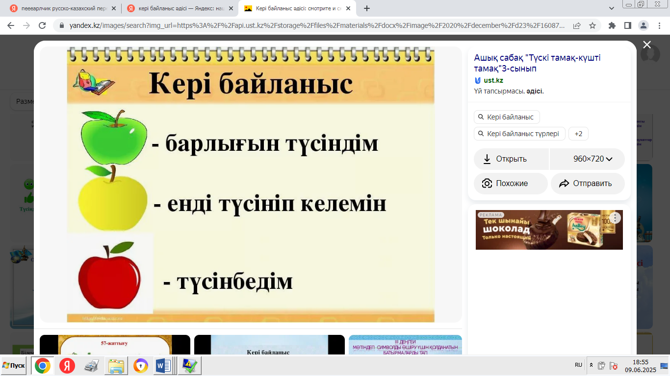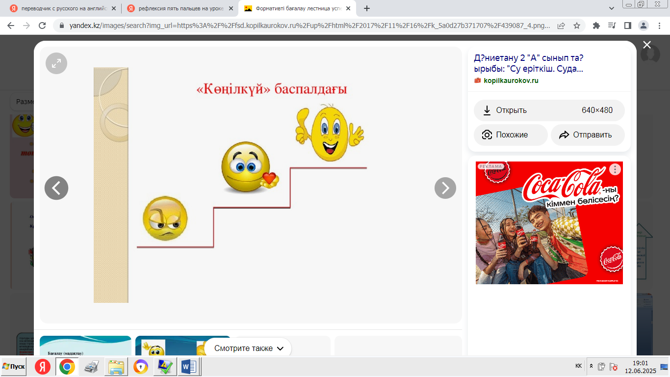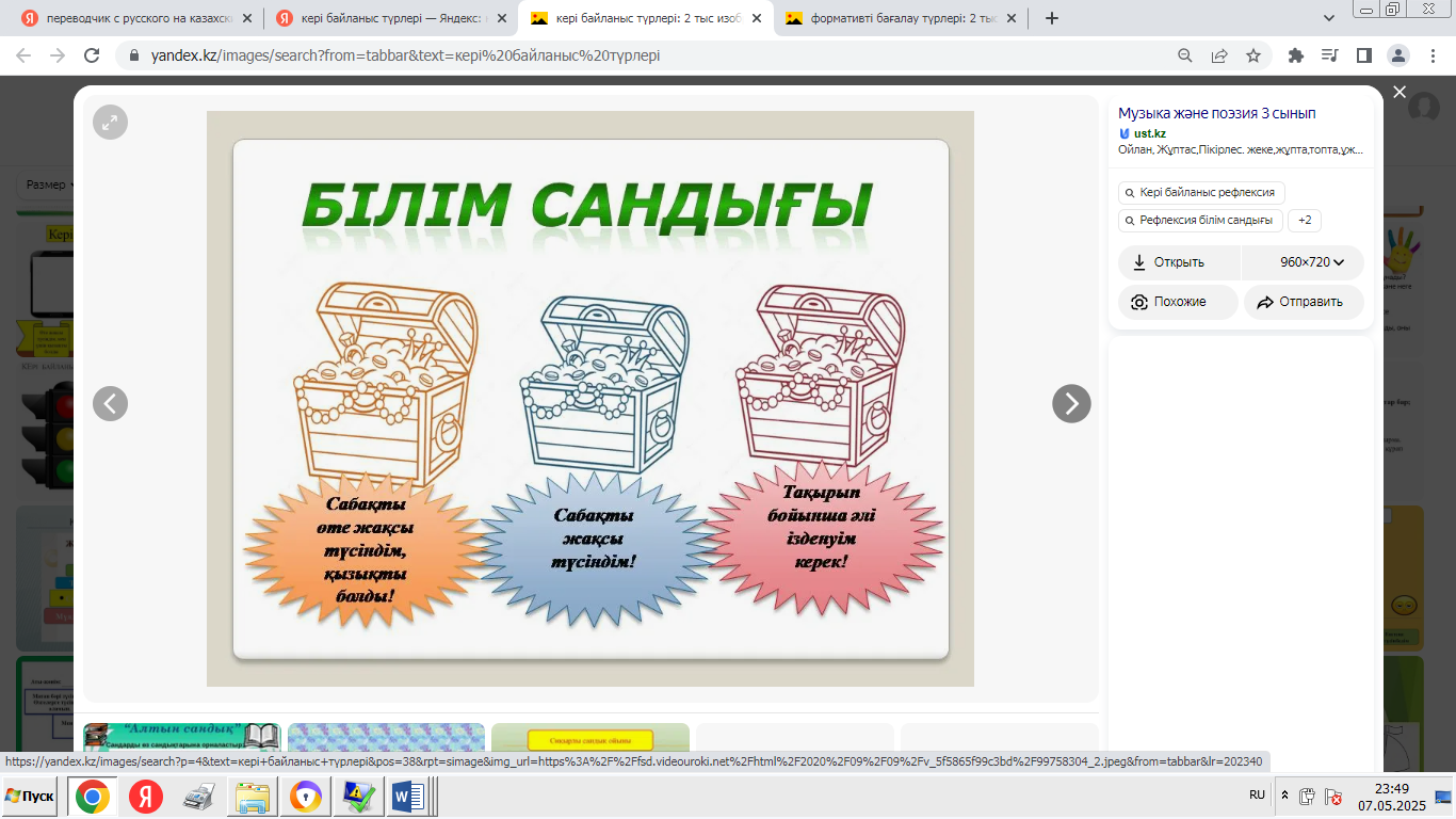 - «Мадақтау және қолдау» ойыны: әрқайсысы екіншісінің өнімділігі туралы оң пікір айтады. -Сабақтың қорытындысы: «Ең жақсысы не болды?», «Нені жақсартуға болады?» - «Менің жобаны қорғау тәжірибем» кері байланыс. - Үй тапсырмасы: жоба туралы қысқаша есеп дайындаңыз. |