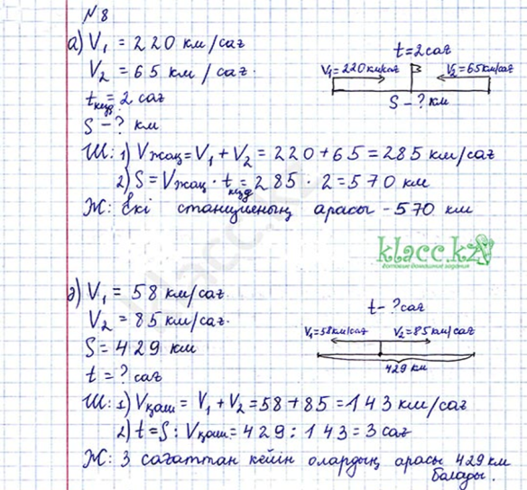 ФС тапсырмасы №8 есеп Графикте жаяу жүргінші мен велосипедшінің 2 сағаттан кейін емес,3 сағаттан кейін кездескені көрсетілген. S=45км V1=3сағ V2=?км\сағ Ш: 45км/3сағ=15км\сағ 15км\сағ-10км\сағ=5км\сағ Ж: Жаяу жүргінші 5км\сағ жылдамдықпен жүрген