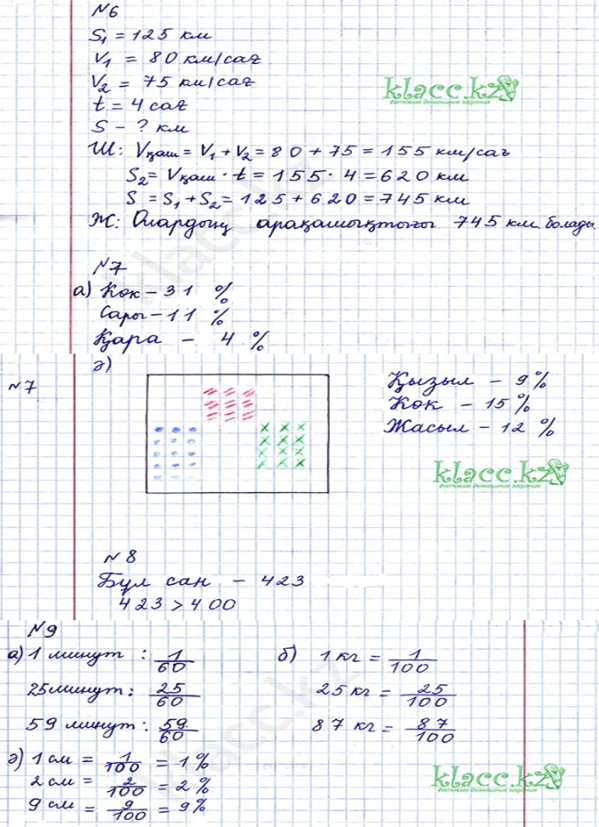 Сергіту сәті №5 есеп 1см- 1метрдің 1% 1мм- 1дециметрдің 1% 1кг-1центнердің 1% № 6есеп S1=125км V1=80км\сағ V2=75км\сағ t=4сағ S=?км Ш: Vқаш=V1+V2=80+75=155км\сағ S2=Vқаш*t=155*4=620км S=S1+S2=125+620=745км Ж:Олардың арақашықтығы 745 км болды №7 есеп А)Көк-31% Сары-11% Қара-4%