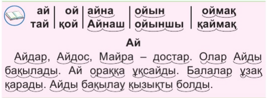 . - Суреттен кімдерді көріп тұрсыңдар? -Олар не істеп жатыр? -Аспанда нелер бар? -Жердің серігі не? -Ай туралы не білесіңдер? Осы сұрақтарға берген жауаптарыңды ретімен мәтін етіп құрап айтыңдар. -Мәтінде неше сөйлем болды? -Бірінші сөйлемде неше сөз бар? - Мәтіндегі й дыбысы бар бір сөзге дыбыстық талдау жасаңдар. -й әрпінің жазбаша түрімен таныс болыңдар. (Ұ, Д) 2- тапсырмада Оқылым «Тез оқы,тез оқы» әдісімен Сөздерді, мәтінді буындап оқыту, тұтас айтқызу. Сөздің алдындағы немесе ортасындағы, соңындағы дыбыс басқа дыбыспен ауыстырылғанда оның мағынасы өзгеретінін байқату.