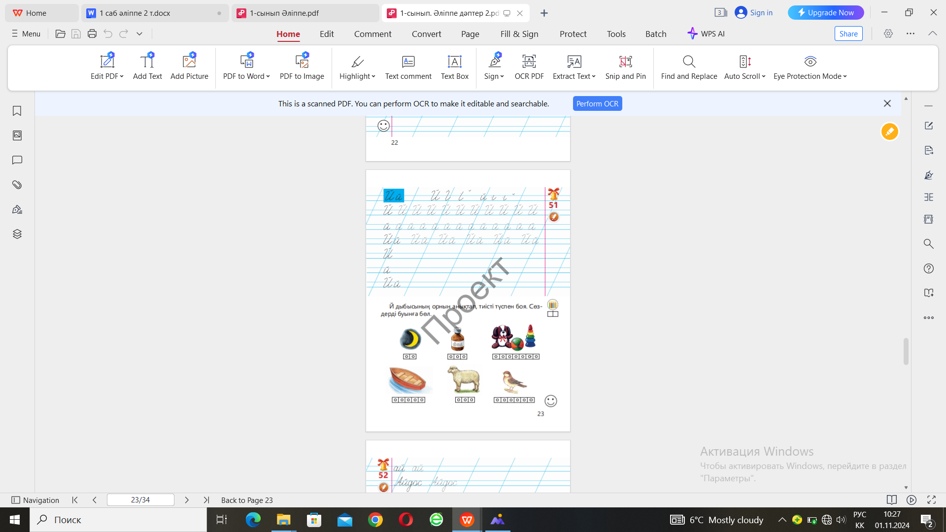 А)Берілген суреттер мен әріптерден сөз құрастырып айтыңдар. (Байрақ) -Байрақ деп нені айтады? -Байрақ сөзіне дыбыстық талдау жасаңдар. Сергіту сәтінде «Нейрожаттығулар» жасату. (Д) 4-тапсырмада өздік жұмыс жүреді. Жазылым 1. Партада дұрыс отырғызады.