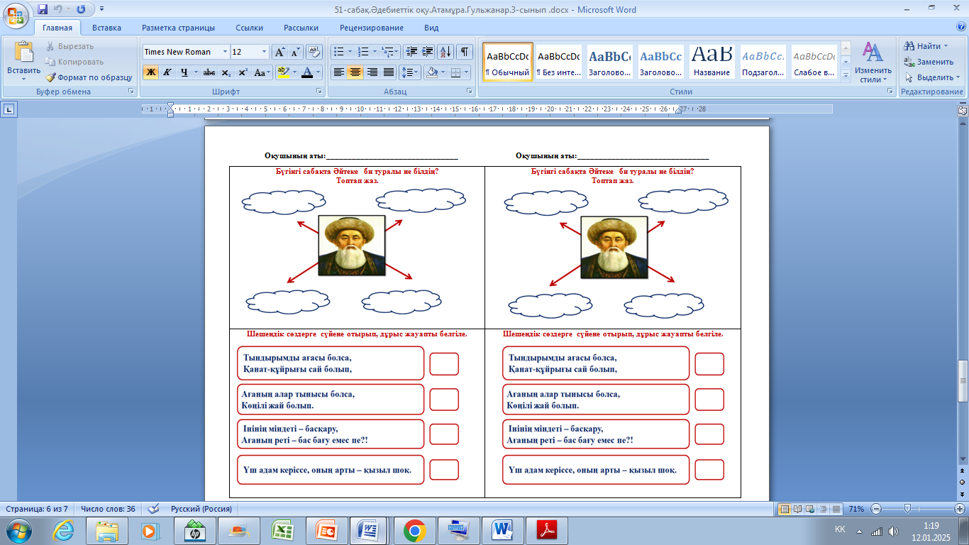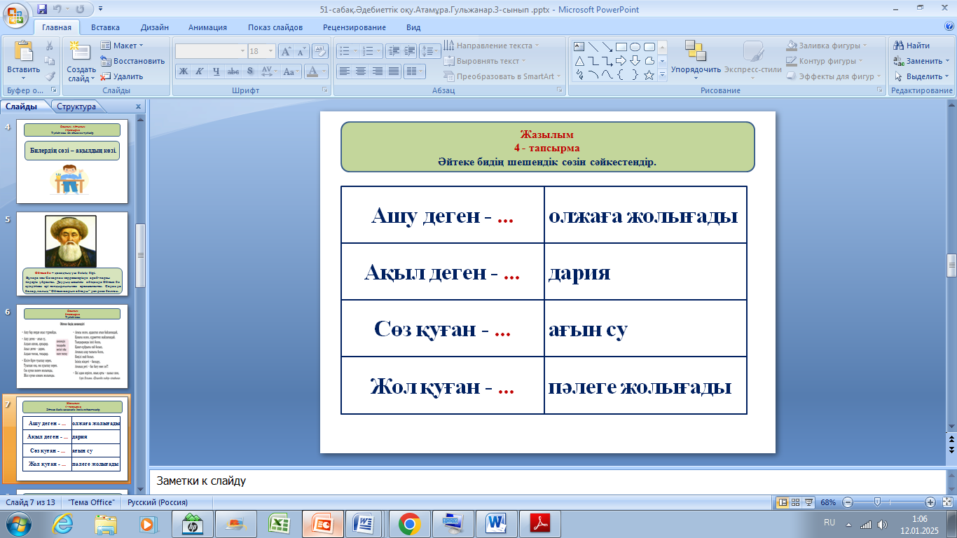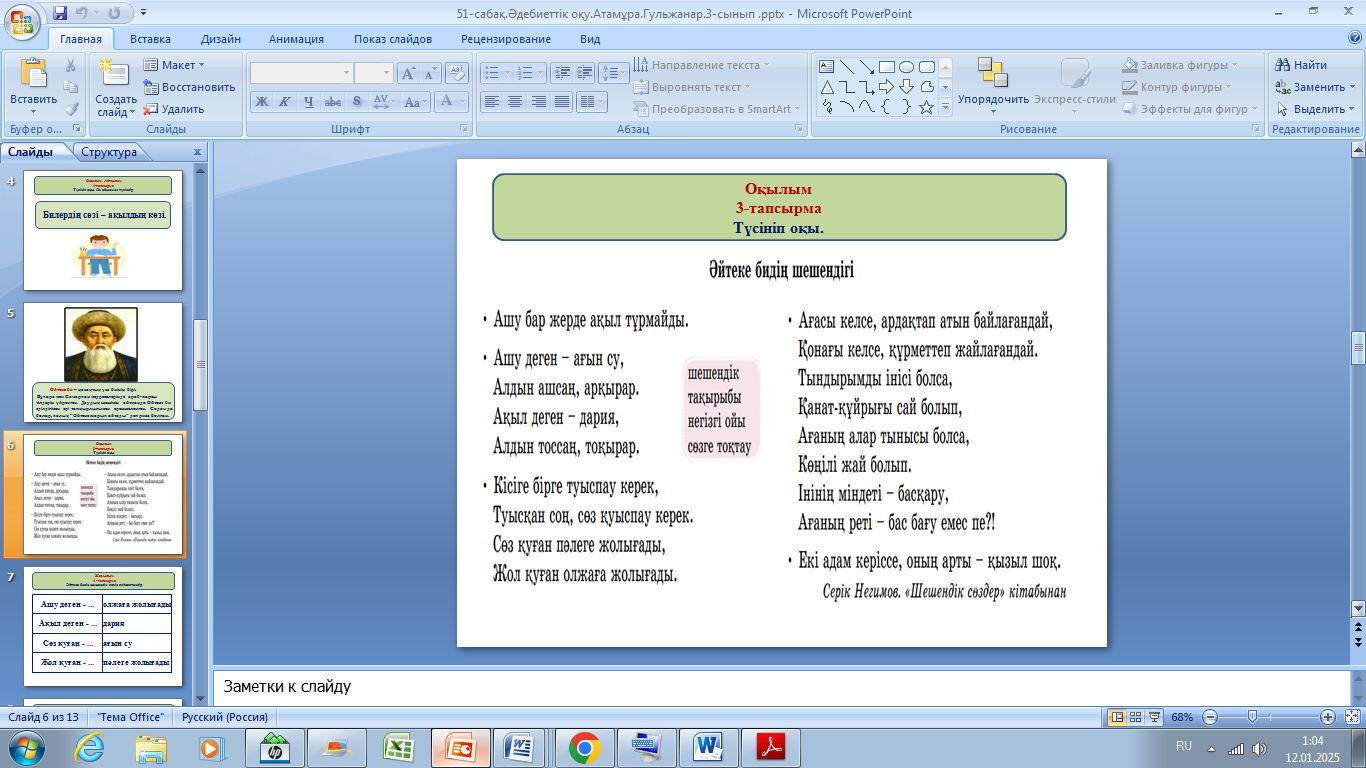 Дескриптор: әр нақыл сөзіндегі тақы рыпты анықтайды-1б негізгі ойды білдіріп тұр ған сөйлемді табады-1б