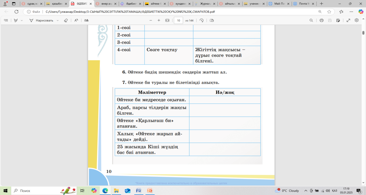 Дескриптор: Әйтеке би туралы білгендерін топтап жазады-1б Шешендік сөздерге сүйене отырып, дұрыс жауапты белгілейді-1б
