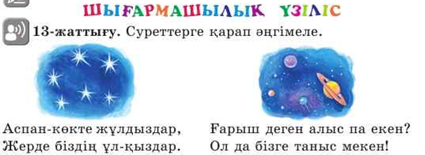 2.3.7.1 сөйлем түрлерінің айтылу мақсатына сәйкес тыныс белгілерін (нүкте, сұрақ белгісі, леп белгісі) қолдану; 2.3.6.1 бас әріп пен кіші әріптің биіктігі мен мөлшерін сақтап, оларды байланыстырып көлбеу және таза жазу; 2.2.3.1 мәтін мазмұнын анықтауға бағытталған сұрақтар құрастыру және жауап беру |