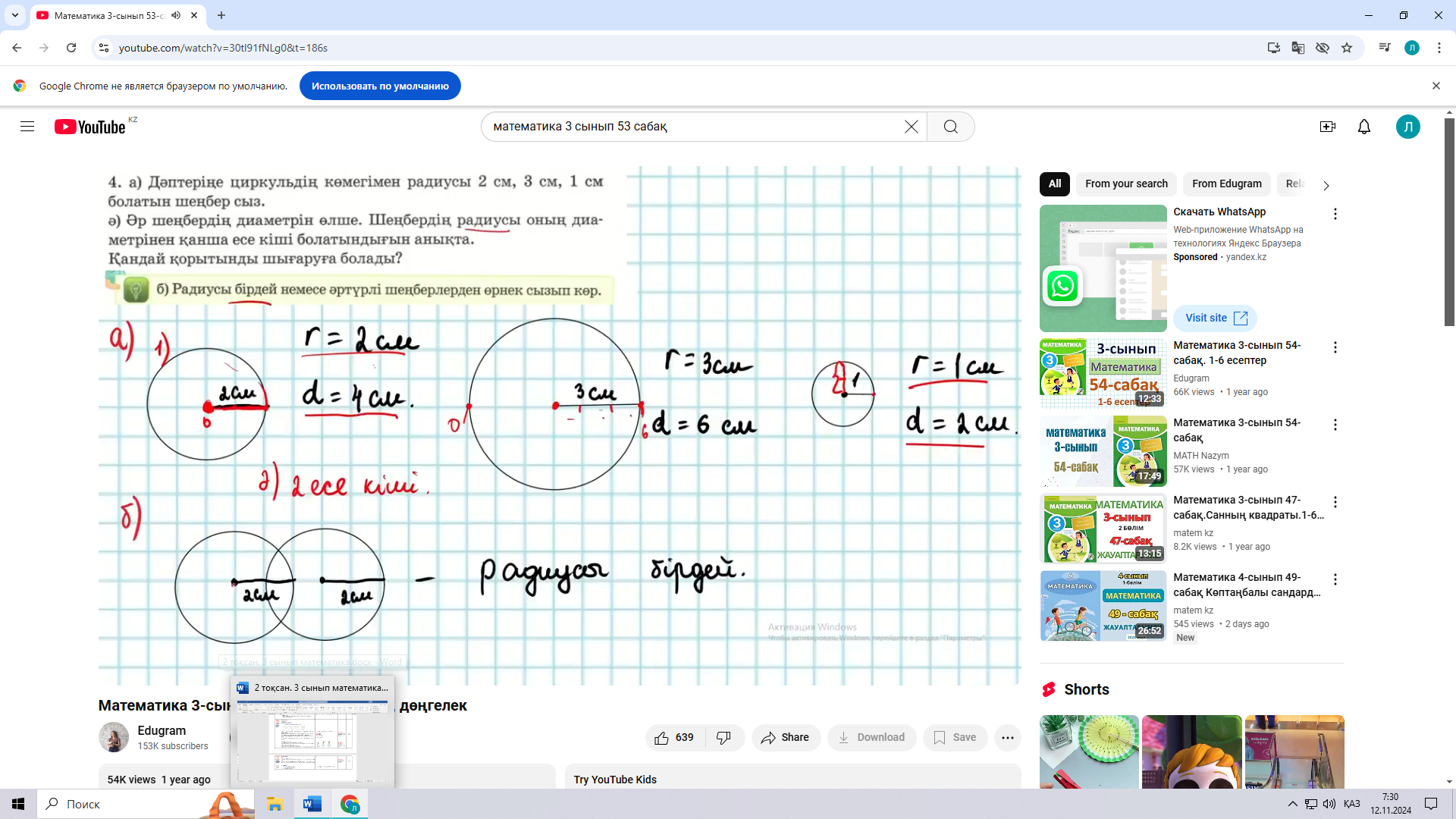 Оқулықпен жұмыс 2 тапсырма «Біліміңді қолдан» әдісі Жазылым; 31бет 4 есеп А) Дәптеріңе циркульдің көмегімен радиусы 2 см, 3 см, 1 см болатын шеңбер сыз. Ә) Әр шеңбердің диаметрін өлше. Шеңбердің радиусы оның диаметрінен қанша есе кші болатындығын анықта. Қандай қорытынды шығаруға болады? Б) Радиусы бірдей немесе әртүрлі шеңберлерден өрнек сызып көр. Жазылым; 32 бет 5 есеп