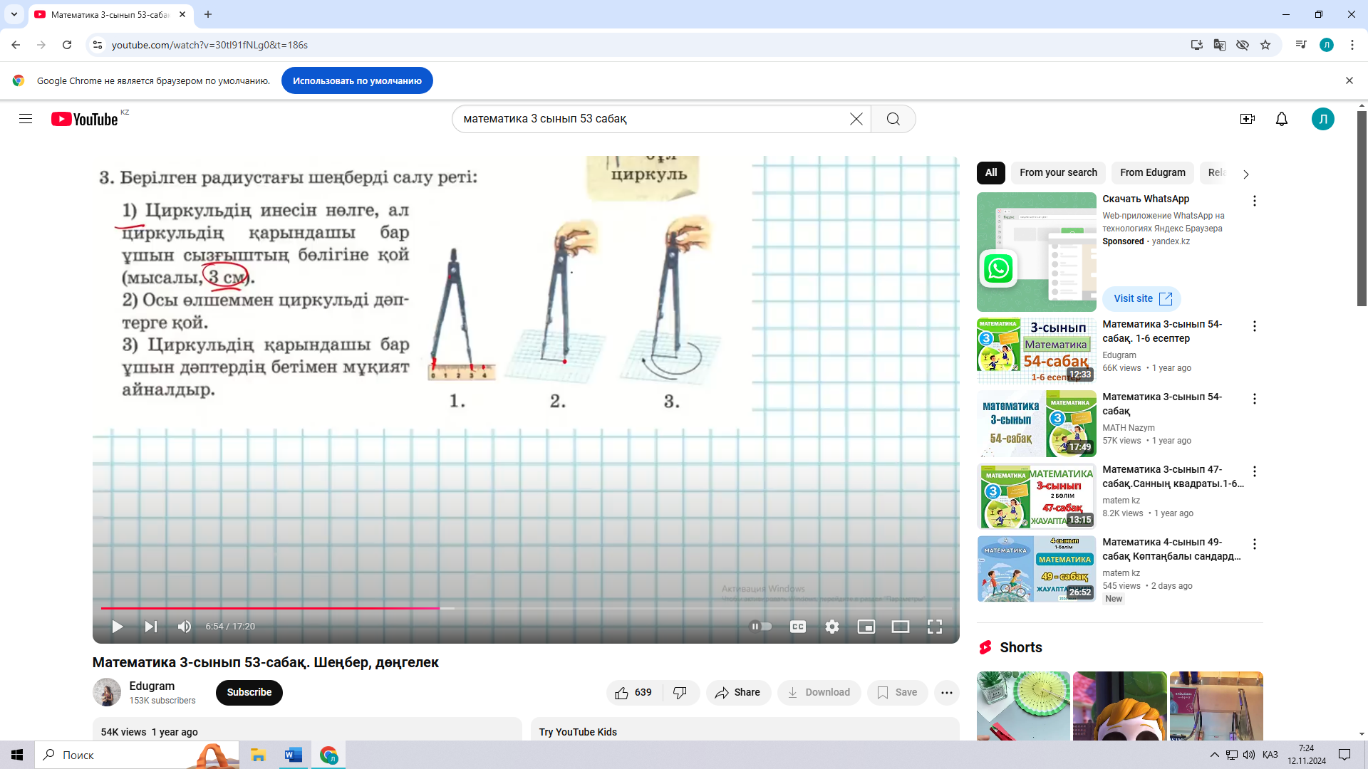 53 сабақ. Шеңбер, дөңгелек және олардың элементтері ( Математика 2 бөлім 30 – 32 бет Алматыкітап баспасы, 2018 ж.) |