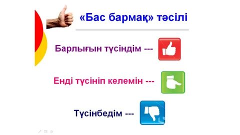 Бүгінгі сабақтағы өзінің әрекеті туралы, жаңа білімді меңгерудегі өзінің жетістіктері мен қиыншылығы туралы ой бөліседі. өзін бағалайды сабақтан алған әсерлерімен бөліседі Сұрақтар қояды, қосымша түсіндіруді қажет ететін тұстарын айтады. Сабақ немесе тақырып бойынша өз пікірін айтып, болашақта не қалайтынын білдіреді. Оқушы өз оқуында қандай әдістердің тиімді болғанын байқайды. Қателерінің себептерін анықтап, оларды түзету жолдарын ойластырады. өзінің жетістіктерін және қиындықтарын анықтайды. Тапсырма барысында не сәтті болғанын және қай жерде қиналғанын түсінеді. Өзінің жауаптарын және шешімдерін талдайды |