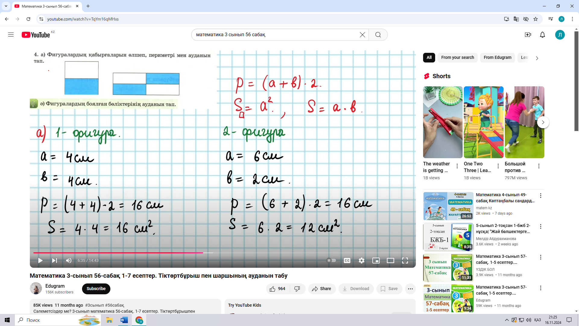 = 4 * 4 = 16 Ә)1 – фигура 2 – фигура а – 4 см а – 6 см b – 4 см : 2 = 2 cм b – 2 см : 2 = 1 см P = ( 4 + 2 ) * 2 = 12 см P = ( 6 +1 ) * 2 = 14 см