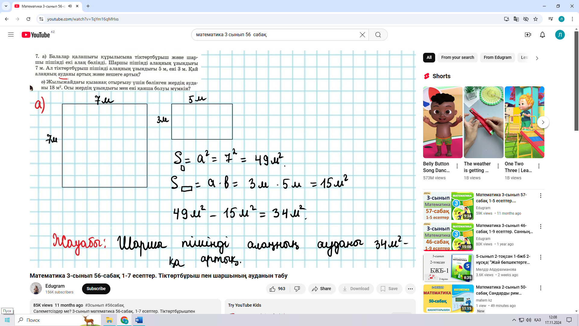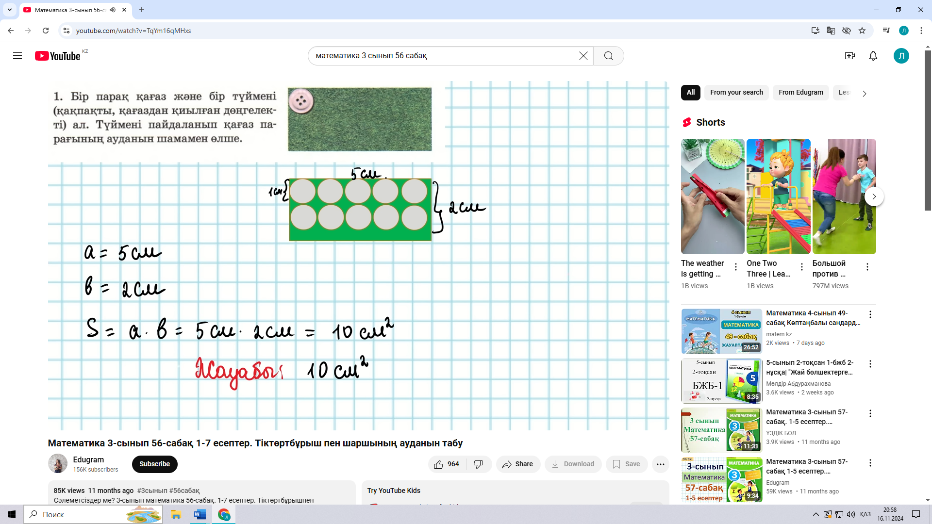 Сынып жұмысы 56 сабақ. Тіктөртбұрыш пен шаршының ауданын табу