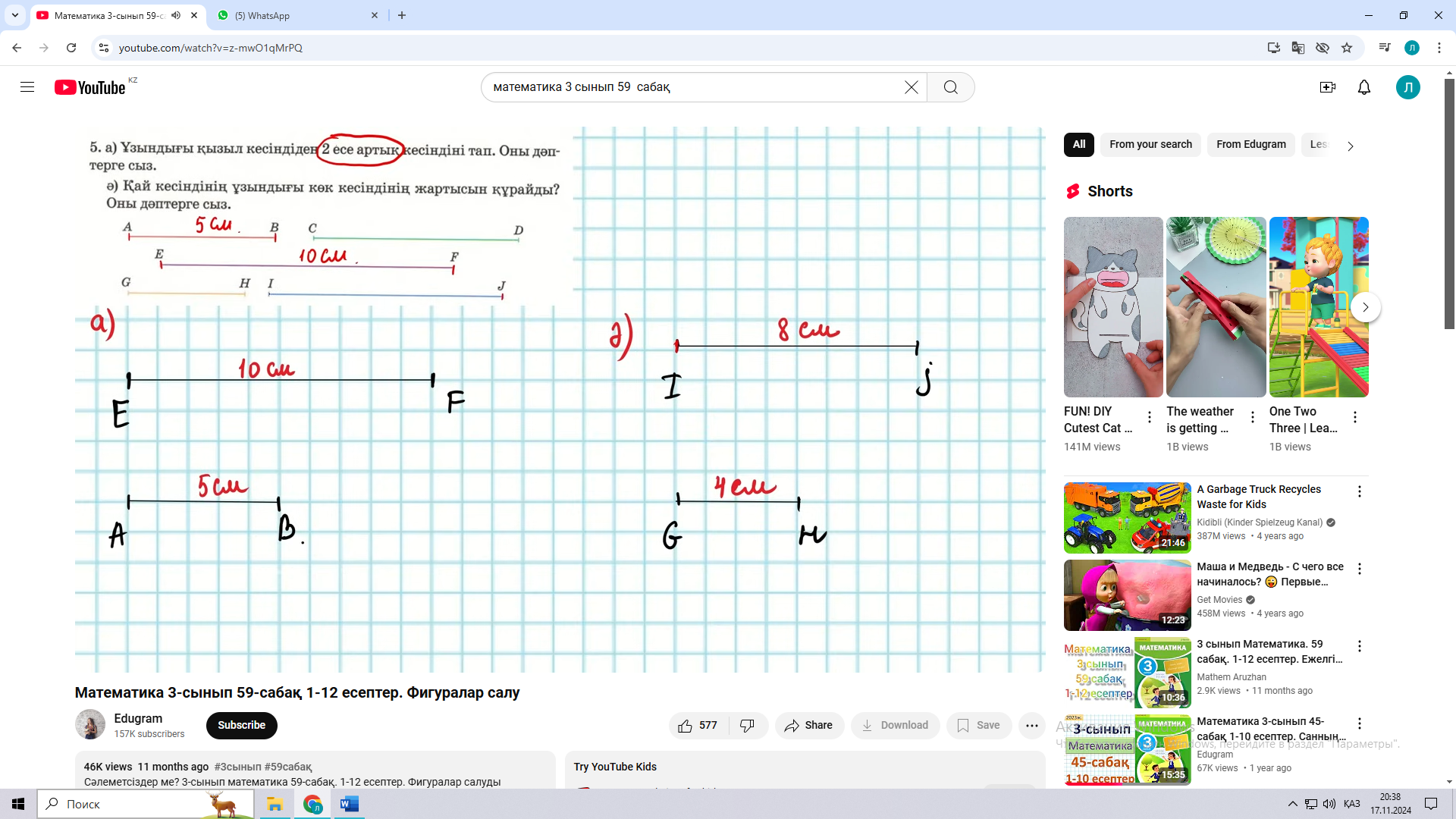 Жазылым; 44 бет 5 есеп А) Ұзындығы қызыл кесіндіден 2 есе артық кесіндіні тап. Оны дәптерге сыз. Ә) Қай кесіндінің ұзындығы көк кесіндінің жартысын құрайды? Оны дәптерге сыз.