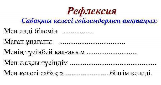 Шығу парағы 1.Бүгін не үйрендің? 2.Сабақ бойынша қандай сұрақтарың бар? 3. Келесі сабақта қандай мәселелерге баса назар аудару керек?