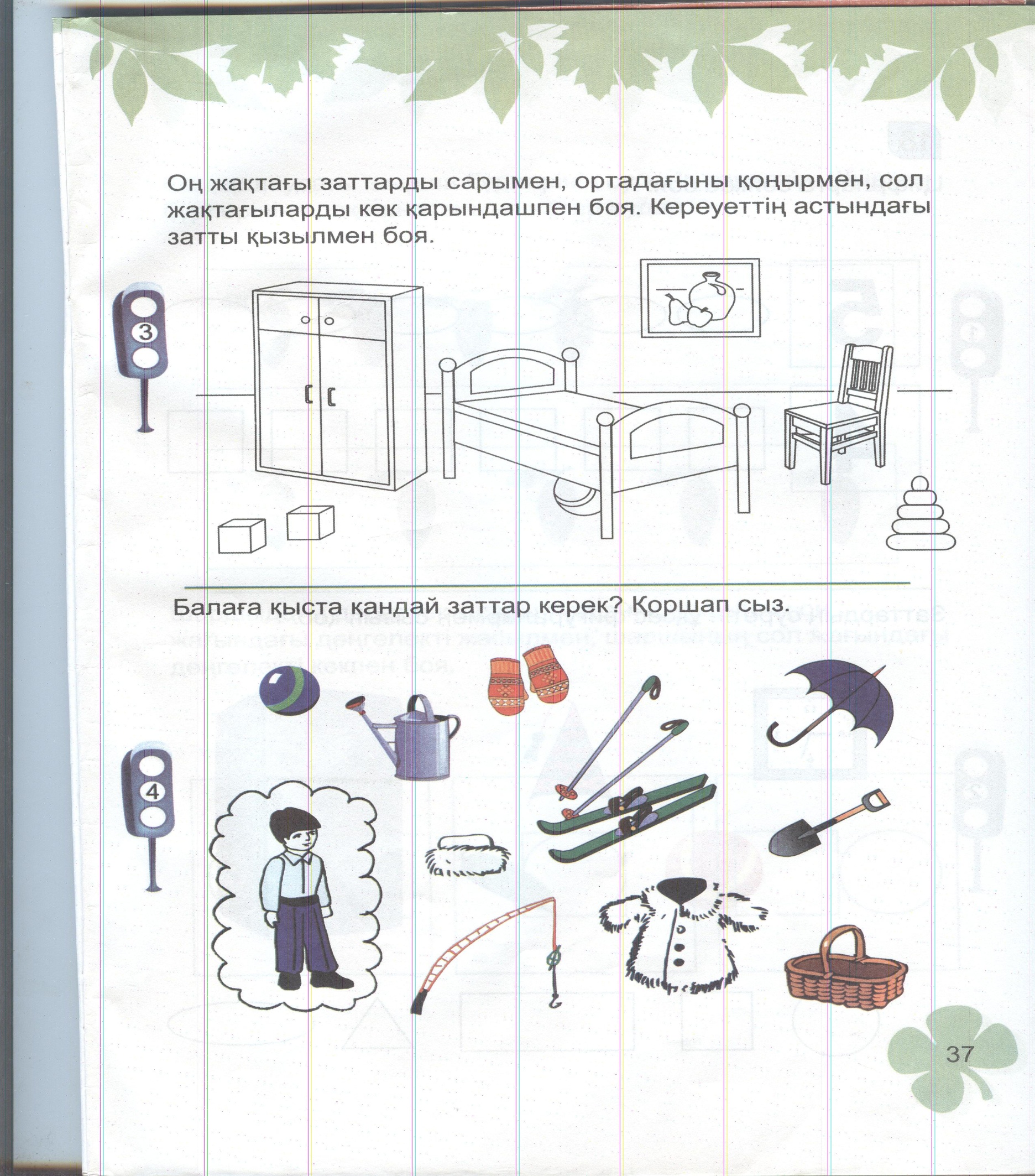 -Оң жақтағы заттарды сары қарындашпен, ортадағыны қоңырмен, сол жақтағыларды көгілдір түспен,ал кереуеттің астында жатқан затты қызылмен бояңдар.