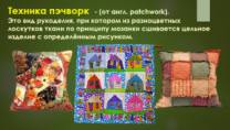 Дизайн швейных изделий в технике текстильной мозаики (пэчворк, квилт, курак и др.). Разработка идей. Эскиз. Выбор и подготовка материала. |