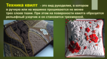 - Проводится исследовательская работа. «Дизайн-анализ изделий, выполненных в технике текстильной мозаики», т.е. исследование различных объектов (изделий) с целью изучения их свойств и характеристик: функциональное назначение, форма, выбор материала, выбор способа производства, композиционное и цветовое решение. |