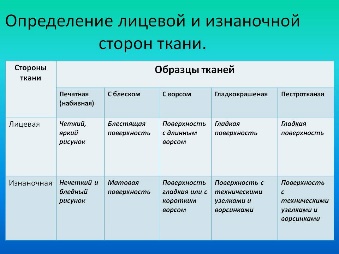 в тканях: Раппорт переплетения - участок, переплетения которого повторяются. 1.Полотняное переплетение -когда нить уткa проходит поочередно то над нитью основы, то под ней. 2.Саржевое переплетение -нить основы проходит под двумя нитями утка, переплетение смещается на одну нить в каждом следующем ряду. На лицевой стороне образуются диагональные полосы слева направо снизу вверх. Саржевое переплетениеимеет отличительную особенность - "рубчик" На поверхности ткани получаются рельефные диагонали. 3.Атласное переплетение - нить основы проходит под несколькими нитями уткá.Ткани имеют на лицевой поверхности удлиненные перекрытия - поэтому лицевая поверхность гладкая и блестящая, а с изнанки матовая. Отличаются от основных большим количеством нитей основы и утка в раппорте. При атласном переплетении нить основы проходит над несколькими нитями утка 4.Сатиновое переплетение- нить уткá проходит под несколькими нитями основы. Такие переплетения придают ткани гладкую поверхность. Activity №2.Учащиеся необходимо определить направления нитей основы и утка, лицевую и изнаночную стороны образцов тканей, используя таблицу. (Учащимся раздается 1образец ткани. Они по очереди определяют нитей основы и утка, лицевую и изнаночную стороны)
