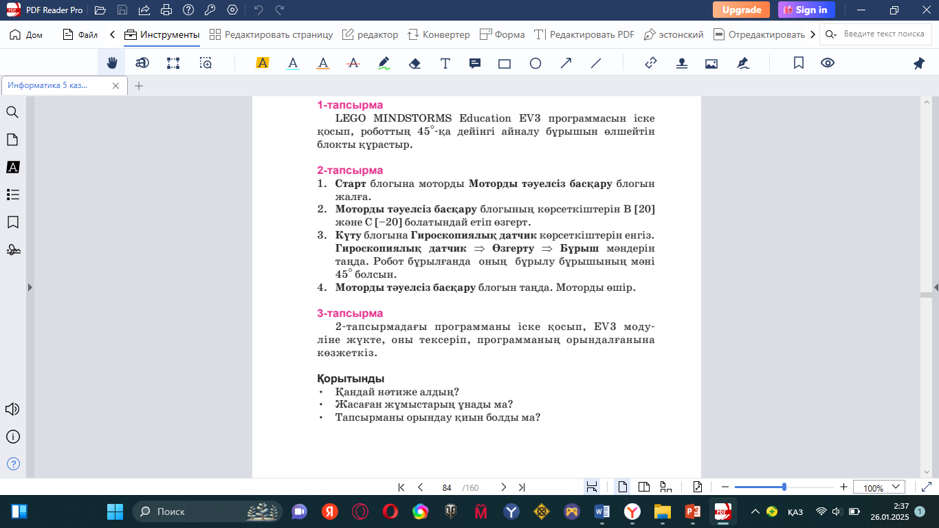 Практикум Жобаның мақсаты: Роботтың бұрыштық бейімділігін анықтау үшін программалар жасау. Жеке жұмыс. 1-тапсырма LEGO MINDSTORMS Education EV3 программасын іске қосып, роботтың 45 градусқа дейінгі айналу бұрышын өлшейтін блокты құрастыр.