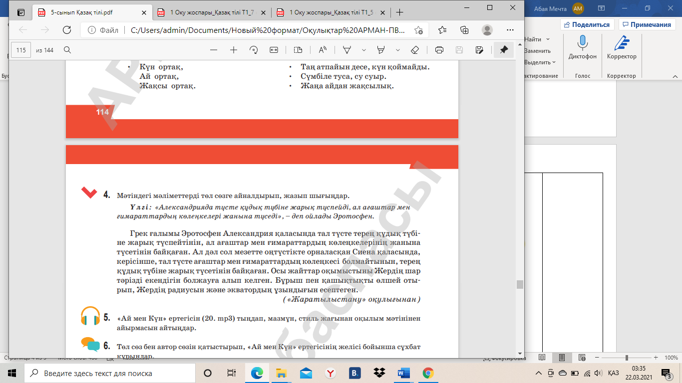 Оқылым, жазылым мақсаты бойынша: Мәтіндегі негізгі және қосымша ақпаратты анықтайды; Пəнге қатысты сөздік қор мен терминдер: оқылым, тыңдалым, негізгі ақпарат, қосымша ақпарат, жинақы мәтін. Әдеби тіл нормасы бойынша: Төл сөз, төлеу сөз, автор сөзінің тыныс белгілерін дұрыс қолданады. |