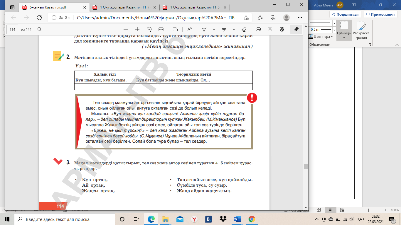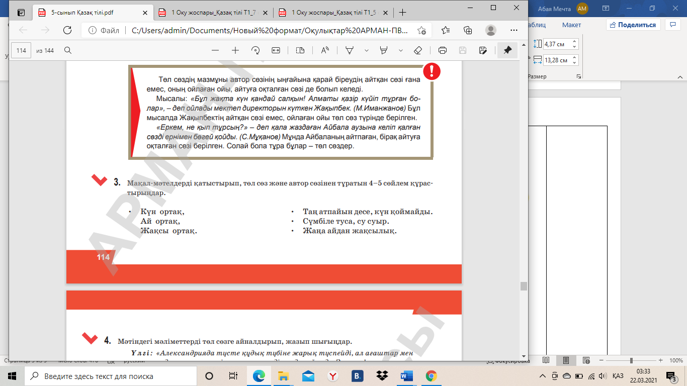 5.2.1.1. Мәтіндегі негізгі және қосымша ақпаратты түсіну, анықтау. 5.4.5.5. Төл сөз, төлеу сөз, автор сөзінің тыныс белгілерін дұрыс қолдану |