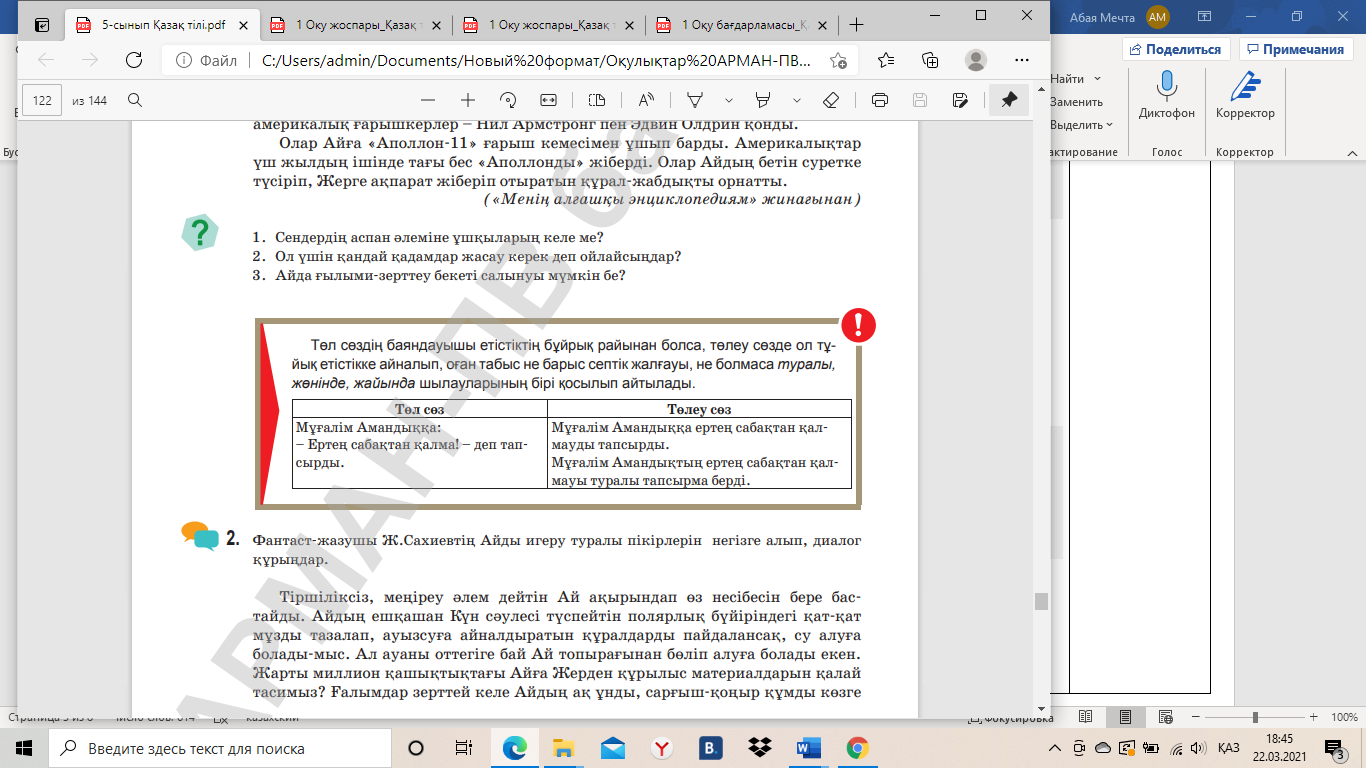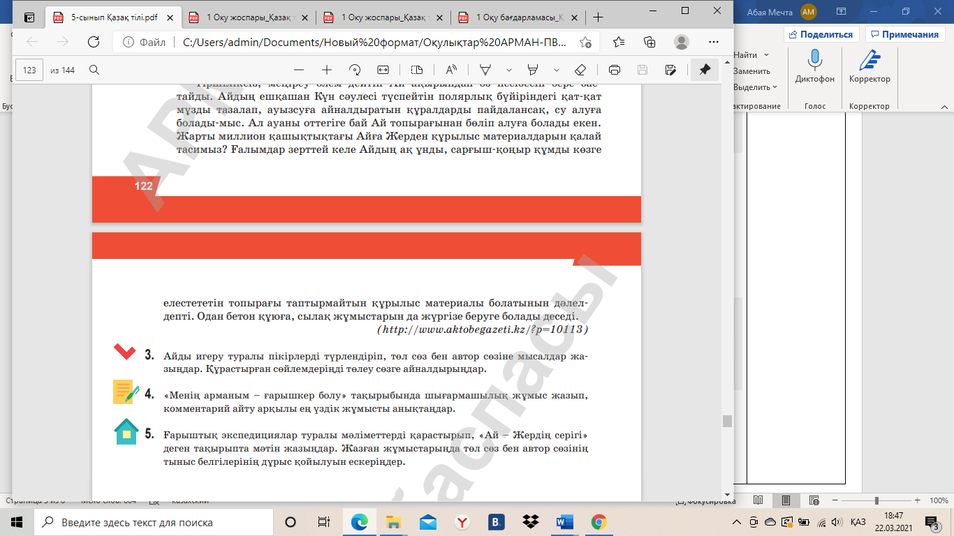 5.3.5.1 оқылым және тыңдалым материалдары бойынша негізгі ақпараттарды сақтай отырып, жинақы мәтін жазу; 5.4.5.5. Төл сөз, төлеу сөз, автор сөзінің тыныс белгілерін дұрыс қолдану. |