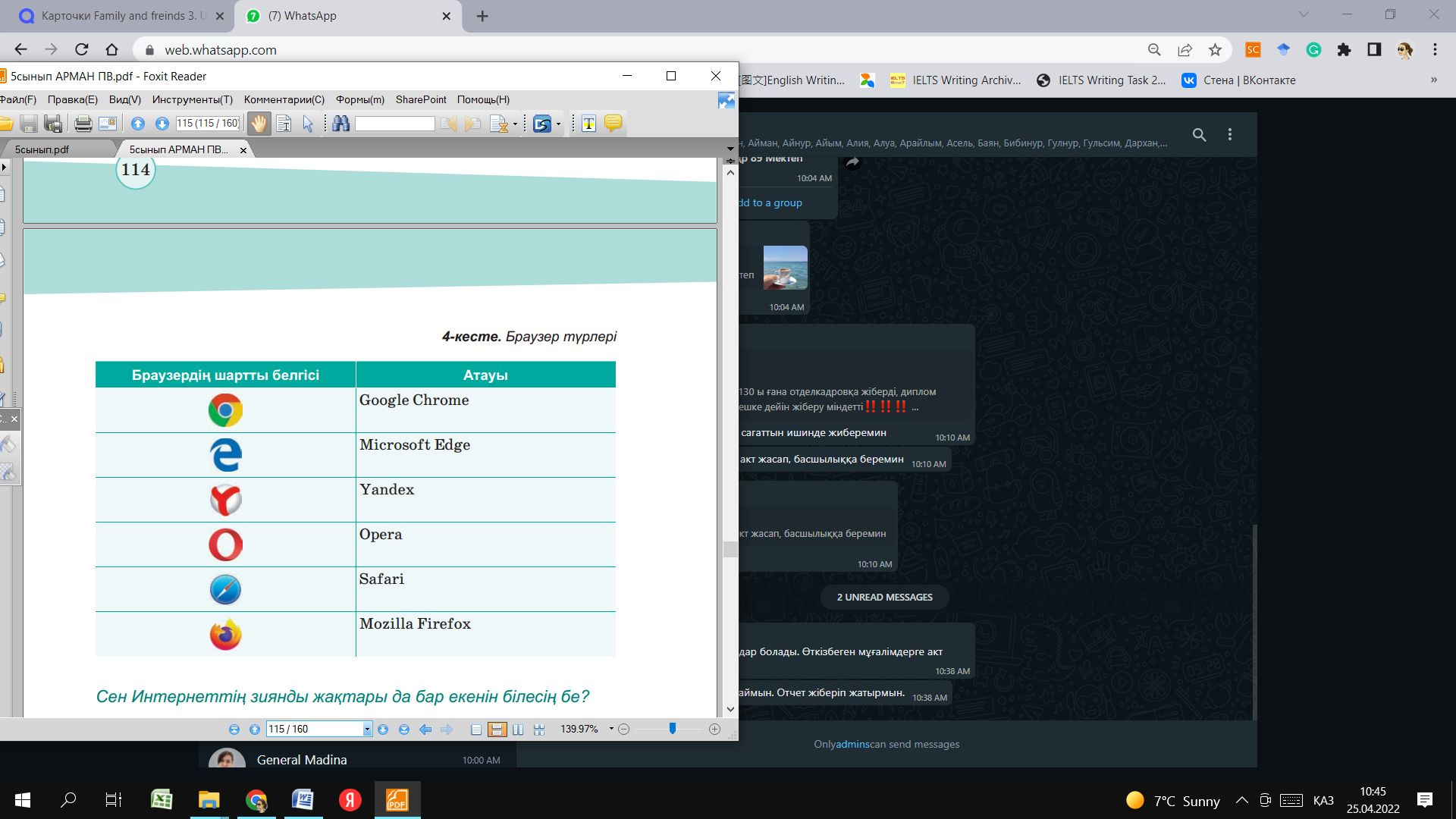 5.1.1.1 сандық ақпарат тасымалдағыштарды сипаттау 5.4.2.2 құжаттарға пароль орнату; 5.1.3.1 ортақ файлдарды орналастыру, өзгерту, жүктеу |