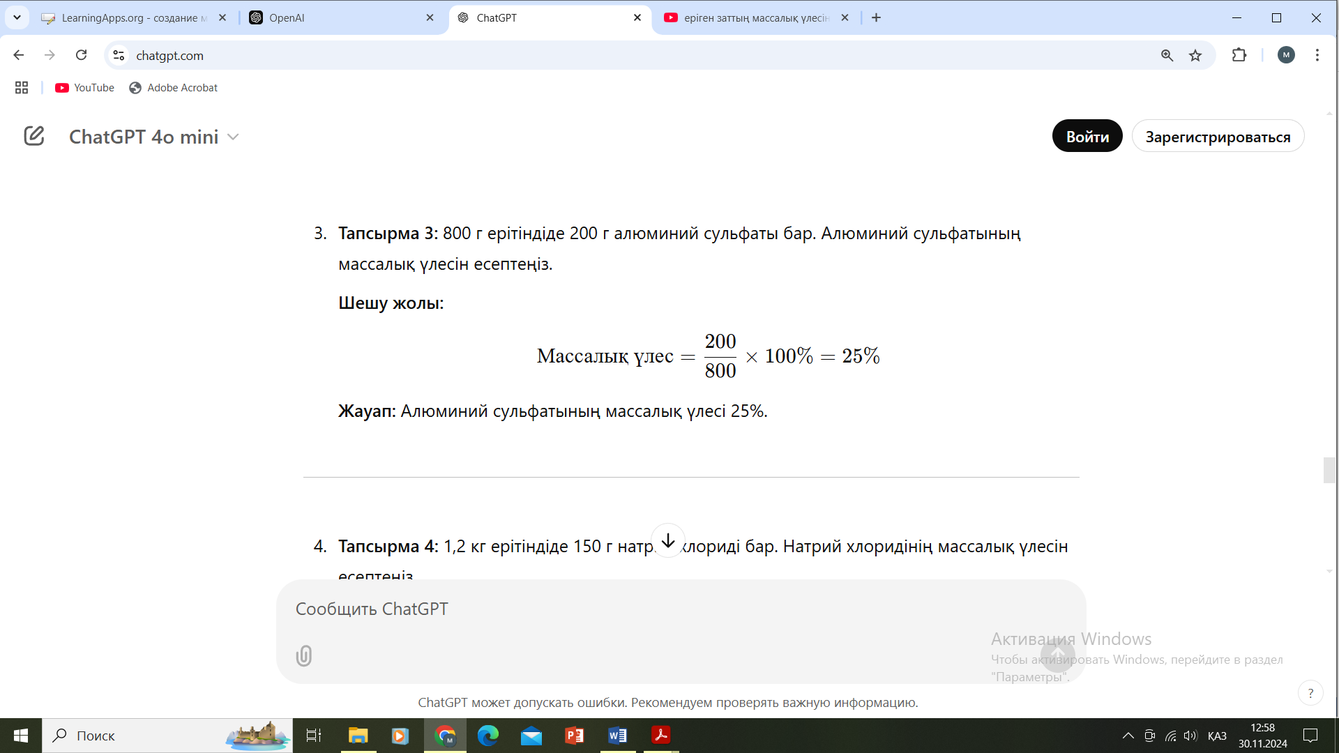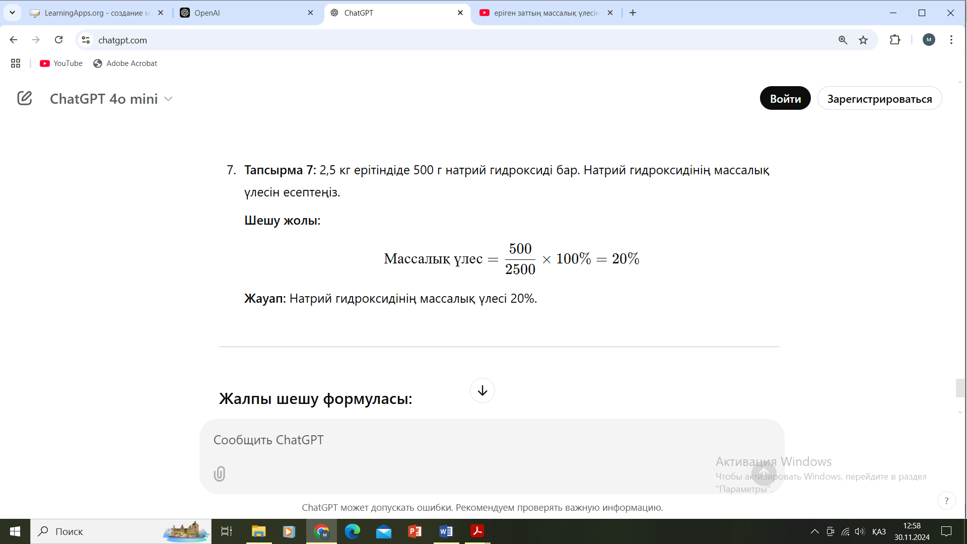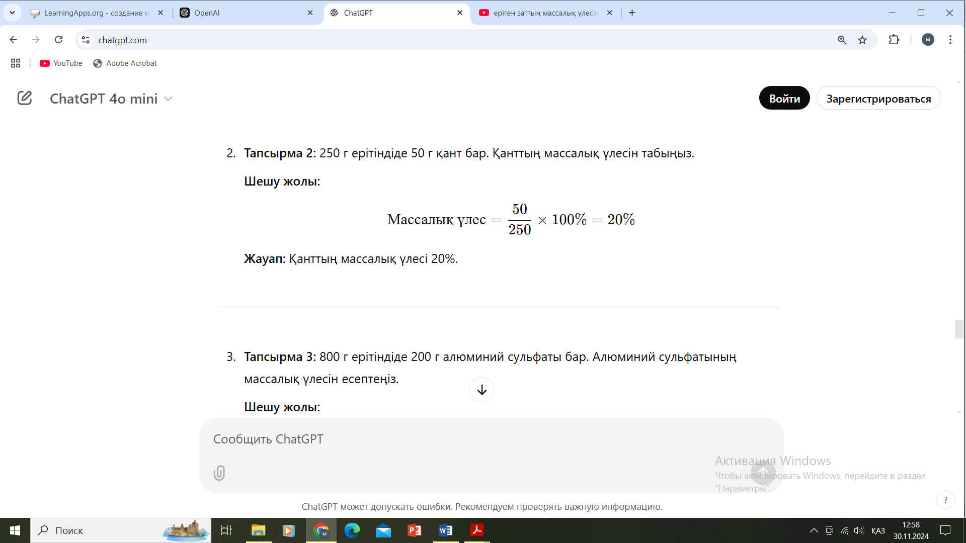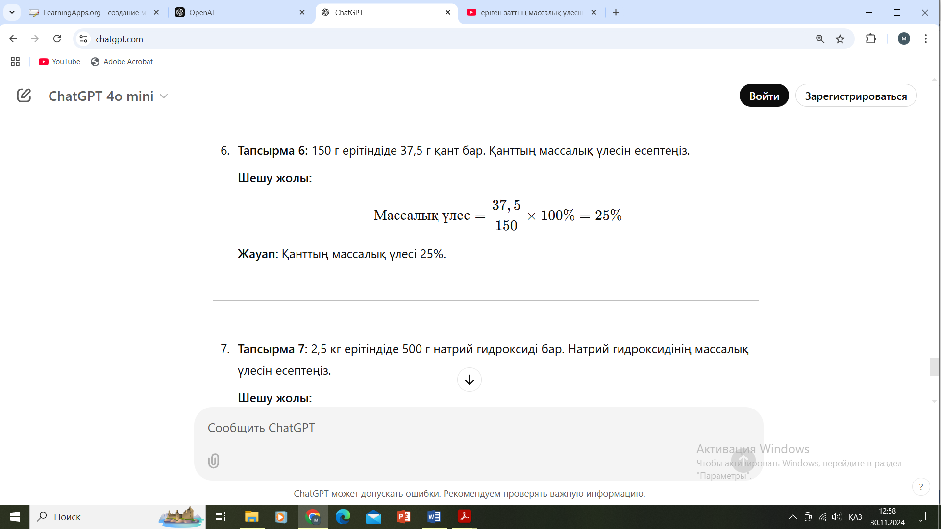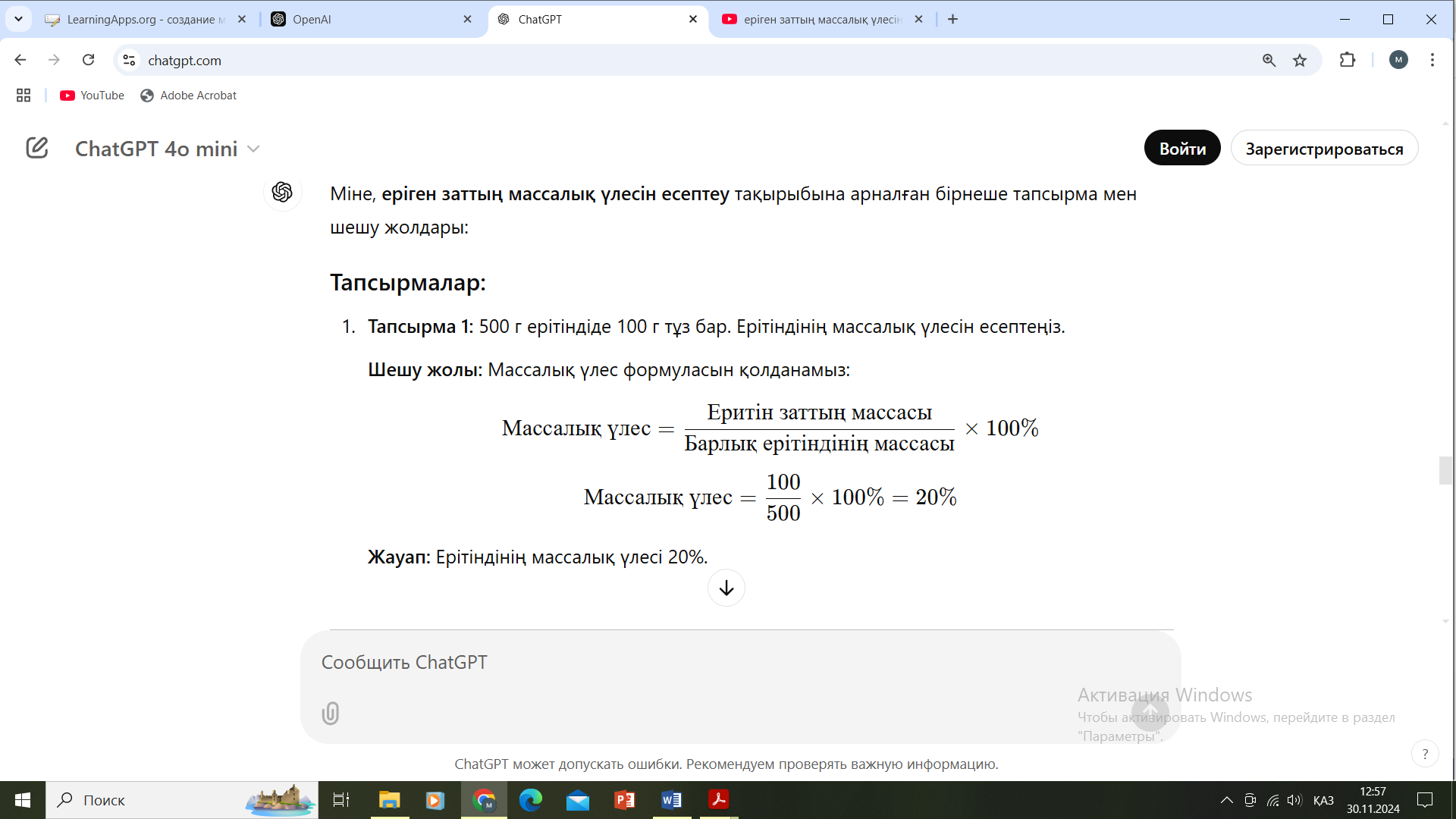 (ЖТ) Жеке тапсырма (ЕББҚ) LearningApps бағдарламасы арқылы Ерітінділердің массалық үлесін есептейді