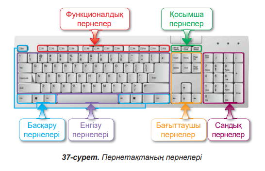 Балалар, қараңыздаршы, мына суретте не көріп тұрмыз? (күтілетін жауап: пернетақта) – Дұрыс, бұл — пернетақта. Енді айтыңдаршы, пернетақтаның қай жерінде әріптер орналасқан? – Ал сандар ше? – Пернетақтаның қандай арнайы пернелерін білесіңдер? (Enter, Shift, Backspace, CapsLock, Delete) – Жарайсыңдар! Ендеше, әр бөлігін жеке таныстырайық: 1) Әріптік-сандық блок. 2) Функционалдық пернелер. 3) Басқару пернелері. 4) Меңзерді басқару. 5) Сандық блок. |