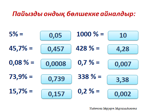 сұрақтарға жауап береді Тақырып бойынша ресурстарды қарап, танысады. Бөлшекті немесе натурал санды пайызбен жазу үшін, оны 100ге көбейтіп,пайыз белгісін тіркеп жазу керек |