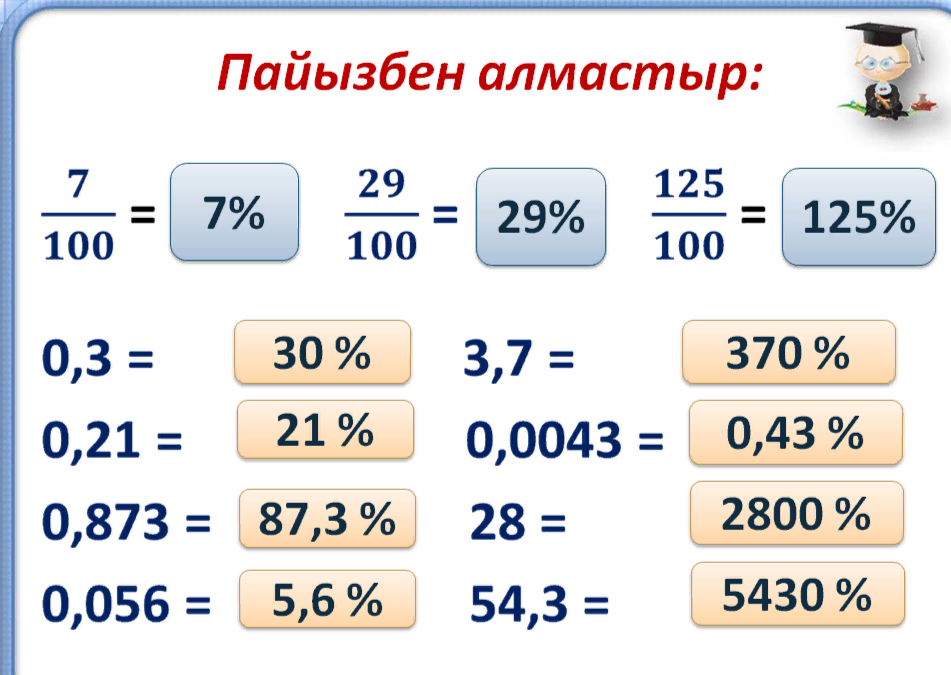 5.1.1.16 пайыз ұғымын меңгеру; 5.1.2.33 бөлшекті пайызға және пайызды бөлшекке айналдыру ; |