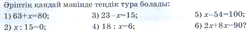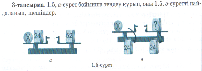 5.2.2.1. Арифметикалық амалдардың белгісіз компонентерін табу ережесі негізінде теңдеулерді шешу 5.2.2.2. Теңдеудің шығарылуының дұрыстығын тексеру тәсілдерін қолдану |