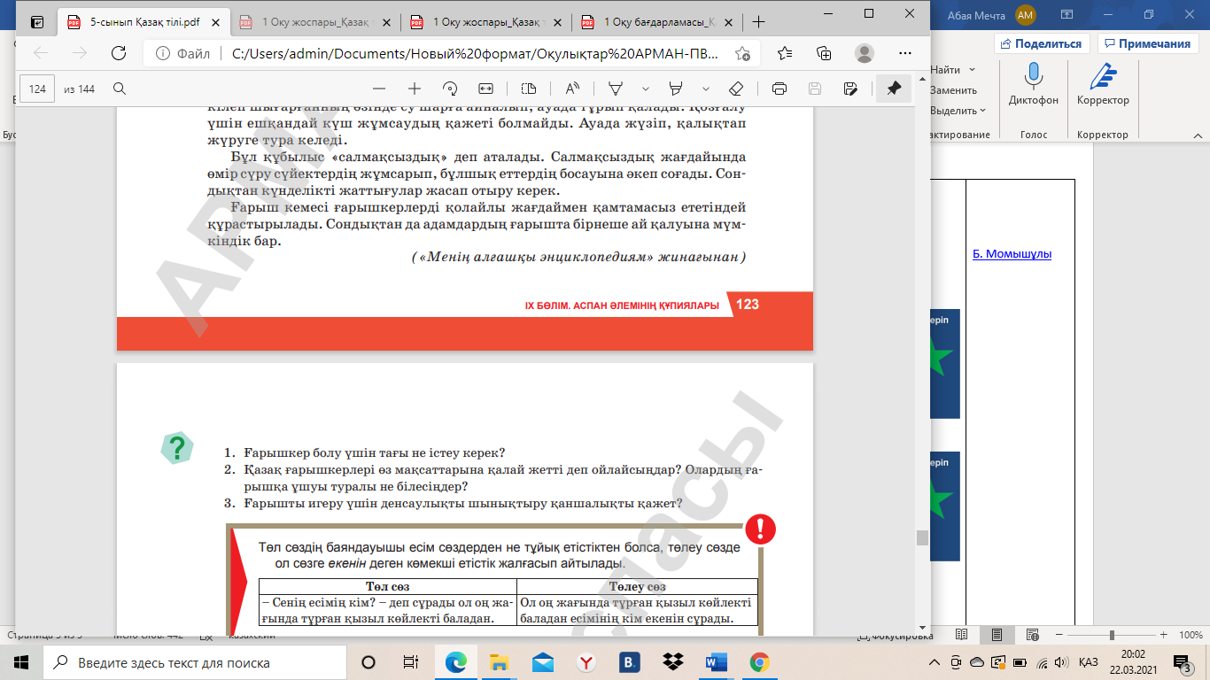 Оқушы мен ғарышкер арасында сұхбат құрастырып жазады; Төл сөз бен автор сөзінің тыныс белгілеріне назар аударады; Оқушы мен ғарышкер арасындағы төл сөздерді төлеу сөзге айналдырады. |