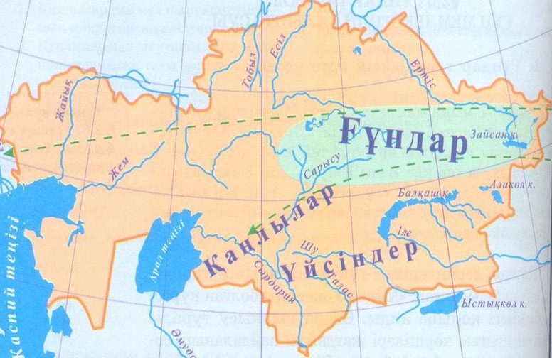 Ғұндардың қоныс аударуының 1- бағытын тарихи картадан көрсетеді; |