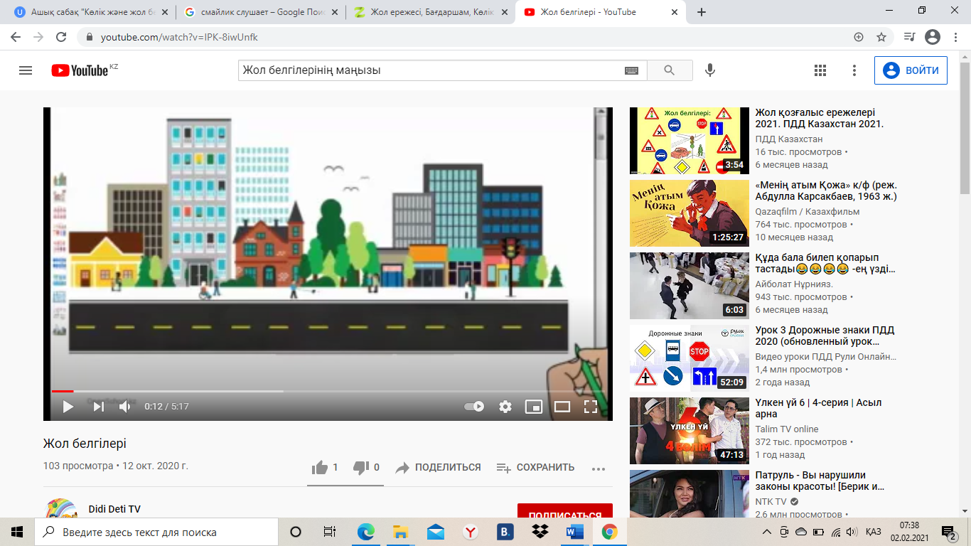 І Ұйымдастыру: Оқушылардың сабаққа қатысуы тексеріледі. Жағымды психологиялық ахуал. «Көңілді шеңбер». -Балалар, шеңберде қалай тұру керек?-деген сұраққа өздері білетін тәртіп ережелерін айтады. Сабақ басында шаттық шеңберін құру «Жылы лебіз» тәсілі арқылы оқушылар жол, сапарға байланысты тілектер жолдайды Қызығушылықты ояту. Оқушылар жол белгілері туралы бейнежазба тамашалайды. Жол белгілерінің маңызы туралы ой түйеді. https://www.youtube.com/watch?v=IPK-8iwUnfk