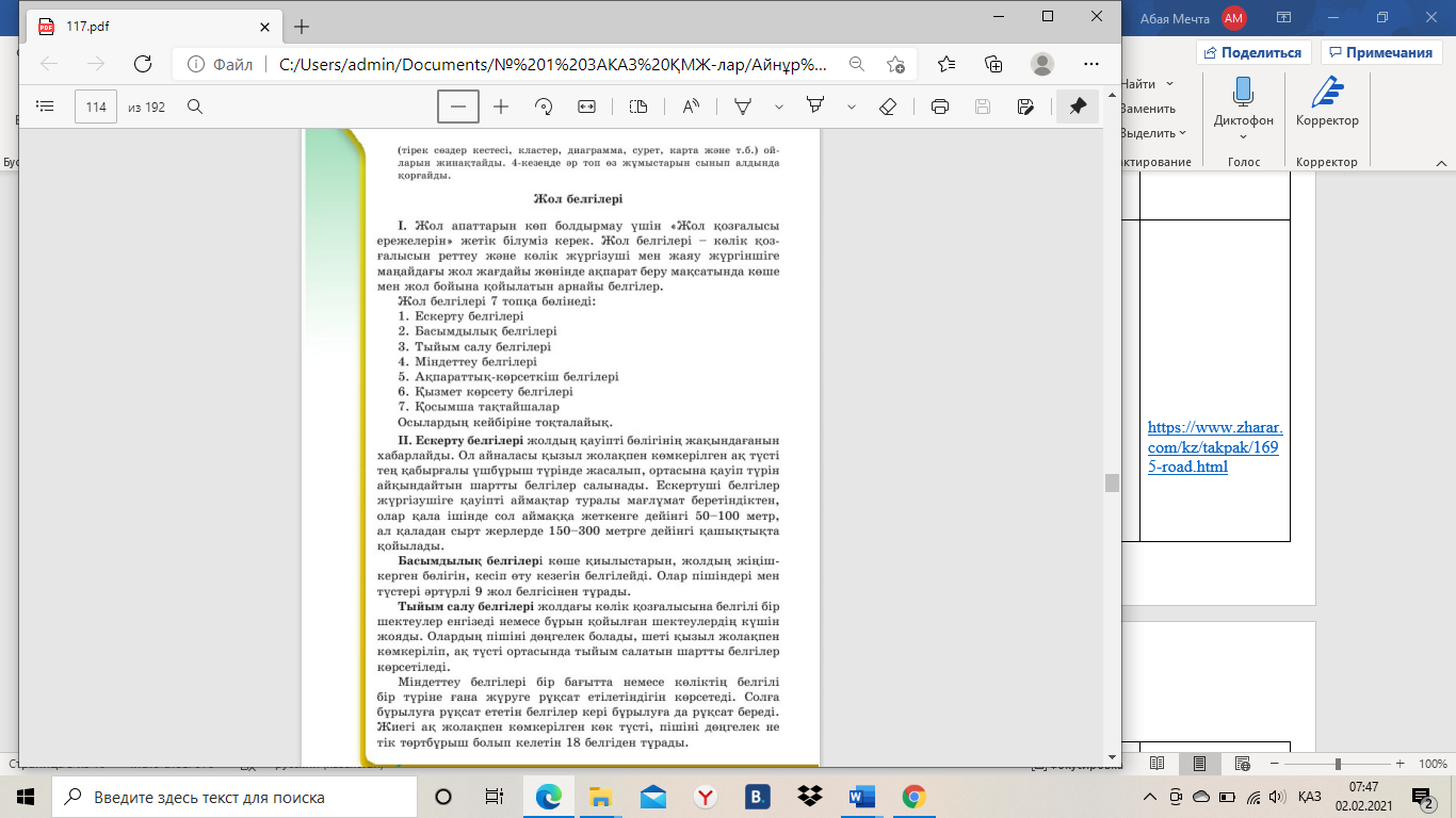 Оқушылар орындай алады: Мәтін бойынша сұрақтарға жауап береді, мәселеге өз ойын айтады. Пәнге қатысты сөздік қор мен терминдер: Бағдаршам, автобус,велосипед, жаяу жүргінші, аялдама, автокөлік, жол полициясы, қауіпсіздік. Диалог құруға / шығарма жазуға арналған пайдалы тіркестер: Транспорт сигналдары, жол жолақтары, қауіпсіздік белдігі, ақпараттық-көрсеткіштік белгілері, шлагбаум Талқылауға арналған сұрақтар: 1.Жол белгілері туралы не білеміз? 2.Жол белгілері бізге не үшін қажет? 3. Оқушыларды жеке бас қауіпсіздігін сақтауға қатысты қандай басты жол белгілерін білесіңдер? |