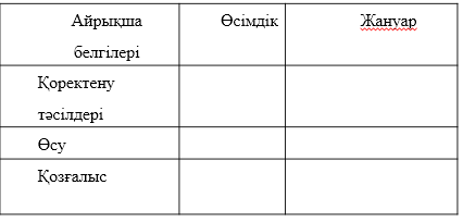 (қозғалыс, тынысалу, сезімталдық, өсу және даму, көбею, бөліп
