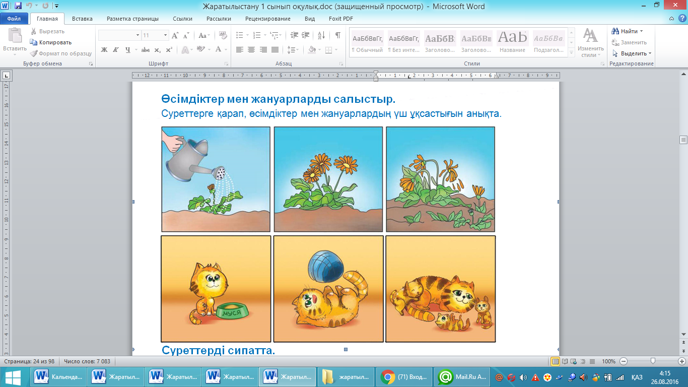 5. Практикалық бөлім Формасы: жұптық Әдісі: проблемалық-ізденушілік- Жаратылыстану» сөзі екі ұғымнан тұрады: «Жаратылыс- табиғат және оны тану». Жаратылыстану ғылымының бірнеше саласы бар. Мәселен, астрономия ғылымы- аспан денелерін, физика-табиғат құбылыстарын зерттейді. Химия-бір заттың екінші затқа айналуы туралы ғылым. География – біздің ғаламшарымыз туралы, биология –тірі табиғатты , экология-тірі ағзалардың бір-бірімен және қоршаған ортамен , сондай-ақ адам мен табиғаттың қарым-қатынасы арқылы қоршаан ортаны сақтаудың ғылыми негізі. Біз өсімдіктерді , жануарларды, жәндіктерді, құстарды көре аламыз. Макро— грек тілінен аударғанда «ұзын, үлкен»деген ұғымды білдіреді. Бұл сөз күрделі ғылыми терминнің бір бөлігі ретінде жиі қолданылады.табиғаттағы үлкен құбылыс пен үдерістерді, сондай-ақ адамдарды да макродүниеге жатқызамыз. Микро- «өте ұсақ, майда» деген мағынаны білдіреді. Микродүние –макродүниенің негізі. Оны үйге немесе құрылыс ғимаратына ұқсатуға болады. Ғимарат тек бір заттан тұрмайды.оны қалау үшін цемент ерітіндісі мен кірпіш, т.б нәрселер қолданылады. Микродүниені микроскоп көмегімен көре аламыз. Қазіргі уақытта ғылымдар микродүниеден де ұсақ денелердің бар екеніне көз жеткізді. Мұндай «микромикродүниеге» жаңадан «нанодүние» деген атау берді. Мега— грек тілінен аударғанда «үлкен» деген ұғымды білдіреді. Оған Жер шары, Ғарыштық кеңістік жатады. «Макро», «мега» т.б. тәрізді ғылымда өзіндік атауы бар сөздер термин ретінде қабылданған. Термин— (лат. –шек, шеті, шекарасы ) деген мағынада айтылады. 2. Топтастыру. Топтастыру арқылы оқушыларға жаратылыстану ғылымдары түсіндіріледі. Кестемен жұмыс. Оқушыларға Жаратылыстану пәні зерттейтін табиғат құбылыстарын түсіндіру.