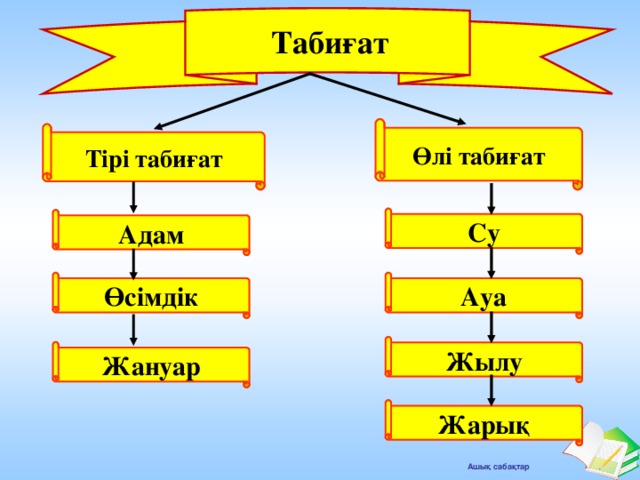 Үйге тапсырма: Көп нүктенің орнына керекті сөзді қойып жазады. Керекті сөздер: табиғатқа, Ай, өсімдіктер, өседі, жанды, өзгермейді 1.Адамдар, жануарлар, құстар ... табиғатқа жатады. 2. ... жанды табиғатқа жатады. 3. Жансыз ... су, тас, тау, Күн жатады. 4... қандай табиғатқа жатады? 5.Жанды табиғат өзгереді, ... . 6.Ал жансыз табиғат ... . Рефлексия