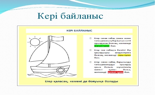 Бүгінгі сабақтан түйген ойлары мен тұжырымдарына байланысты кері байланыс жасайды. |