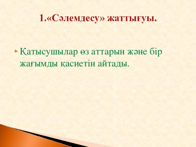 Барлық оқушылар: ауызша мәтіндер құрауда қазақ тіліндегі төл дыбыстардың дыбысталуын, үндестік заңын ескеріп айта алады; қазақша амандасу мәнері мен ұлттық этикет формаларын пайдалана алады. |