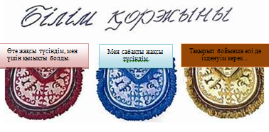Өз деңгейлерін анықтайды. «Аяқталмаған сөйлемдер» әдісі арқылықорыту «Бүгін мен...................... білдім» 2.«................. қызықты болды» «.......................... қиын болды.» 3.« ......................... екенін түсіндім» 4.«Мен..................................... білім алдым.» 5. «.................. мені таң қалдырды.» |