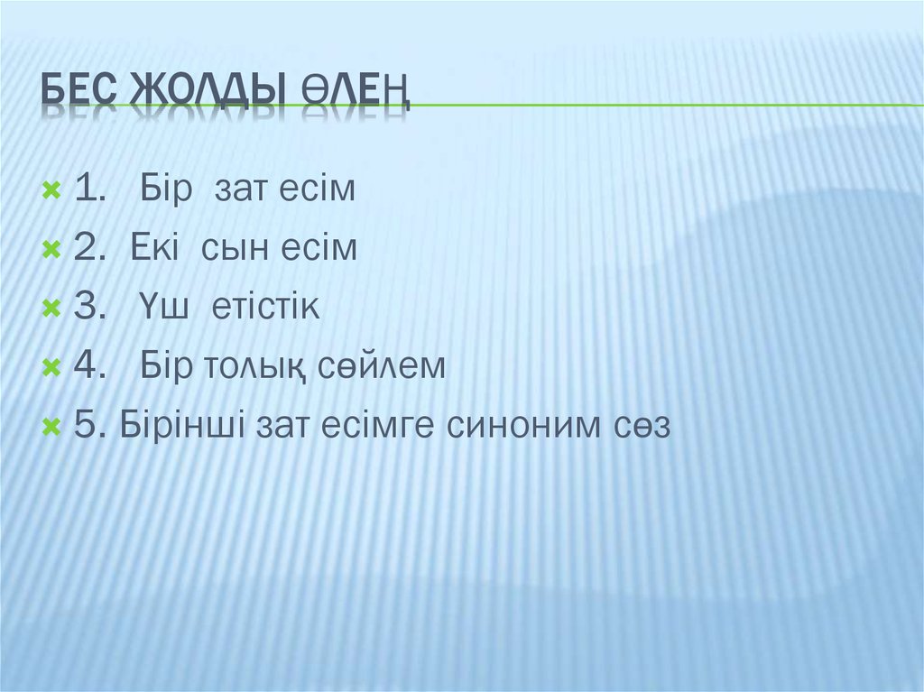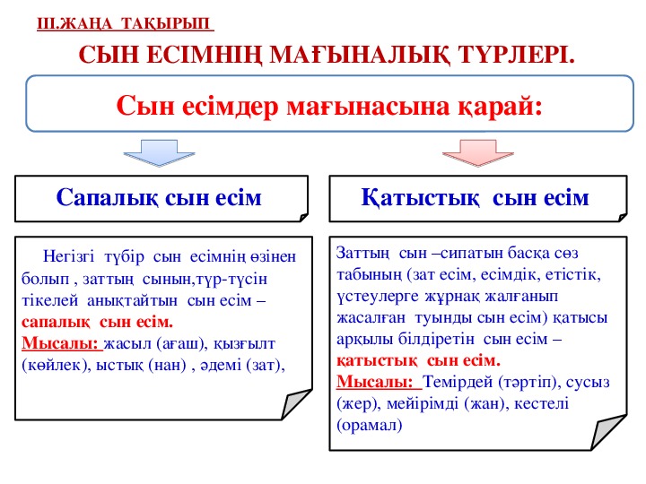 9- тапсырма Топтық жұмыс Сергіту сәті Жазылым Жеке жұмыс 7 – тапсырма. Айтылым 8- тапсырма Жұптық жұмыс Заттардың ішіндегі бір түрінің өзіне ғана койылған аты жалқы есім деп аталады. Мысалы: кісі адам деген жалпы адам атаулыға тән ат болса, Байжан, Гүлнар дегендер адам атаулының бәріне емес, жеке кісілерге ғана қойылған. |