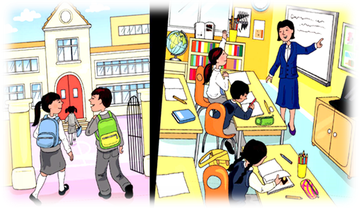 Мектепке барамын, бесінші сынып, тапсырма орындаймыз, қазақ тілінде сөйлесеміз. |