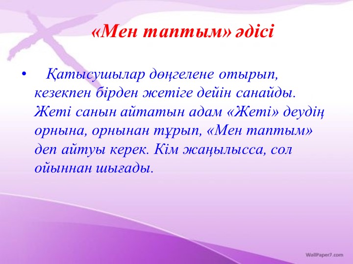 «Психологиялық жағымды ахуал қалыптастыру: - Көңіл күйлеріңіз қалай? - Керемет( қолдарын жоғары көтереді) Сабаққа дайындықтарың қалай: - Тамаша (алақандарын шапалақтайды) Үй жұмысын тексеру Тізбекті сұрау Бұл тәсіл логикалық тапсырмалар орындағанда қолайлы. Бір оқушы сөйлем бастайды. Мұғалім иегімен нұсқаған оқушы сөйлемді іліп әкетіп, ойды жалғастыруы керек. |