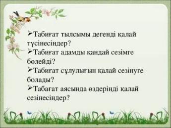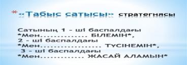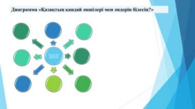 Оқылым Айтылым Мәтінді оқып, ондағы маңызды деректерді анықтайды. Осы мәліметтерді пайдаланып, диалог құрады. Сұрақтарға жауап береді. «Қарлы кесек» тәсілін қолданады. Айтылым Топқа бөлініп, тапсырмаларды орындайды. 1-топ: «Дискуссиялық карта» әдісін пайдаланып, тақырып туралы пікірін білдіреді. 2-топ: «Дөңгелек стол» арқылы өткен тақырып туралы мәтін құрайды. 3-топ: Тақырыпқа қатысты сурет бойынша мәтін құрайды. Айтылым Сөйлемдерді аяқтайды. «Төрт сөйлем» тәсілін қолданып түсіндіреді. Өз ойымен бөлісіп, сыни пікірін білдіреді. Айтылым Диаграммадағы сұрақтарға жауап береді. Жауаптарын дәлелдеп айтады. Оқылым «Бәрін білгім келеді!» ойыны. Берілген сұрақтараға жауап береді. Шарты- шапшаңдық. |